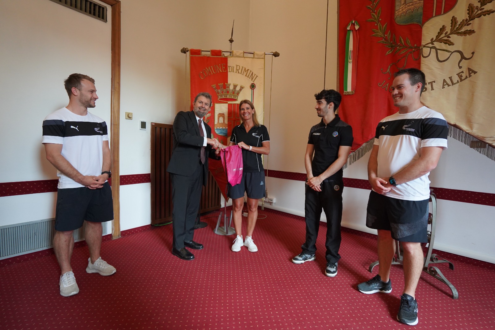L’assessore Maresi ha donato agli atleti lo zainetto simbolico dello sport riminese e ha ricevuto da parte loro la maglietta ufficiale identificativa dell’evento sportivo. Tutta la delegazione, dopo la visita nel Palazzo Garampi è stata accompagna a scoprire la bellezza del Teatro Galli, come segno di benvenuto in città.