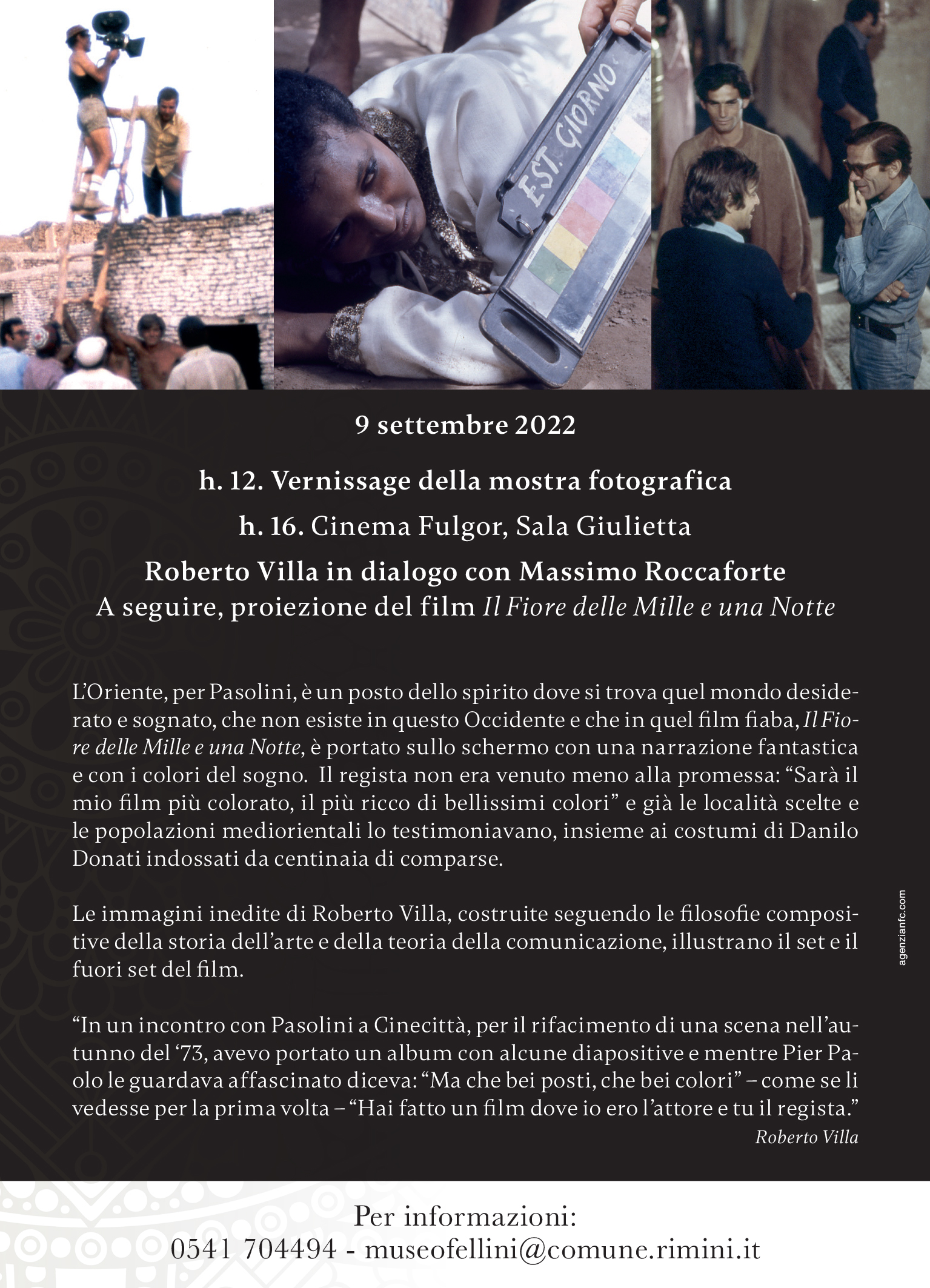 Il 9 settembre al Palazzo del Fulgor sarà inaugurata una mostra dedicata a Pier Paolo Pasolini per celebrare il centenario della sua nascita. Nel palazzo settecentesco che ospita su tre piani la sede del Fellini Museum dedicata principalmente all’informazione, allo studio e all’immaginario di Fellini attraverso documenti, immagini, locandine originali, immagini, approda la mostra delle foto di Roberto Villa sul set del film “Il fiore delle Mille e una notte”, realizzato da Pasolini nel 1973 quale ultimo capitolo della Trilogia della vita.