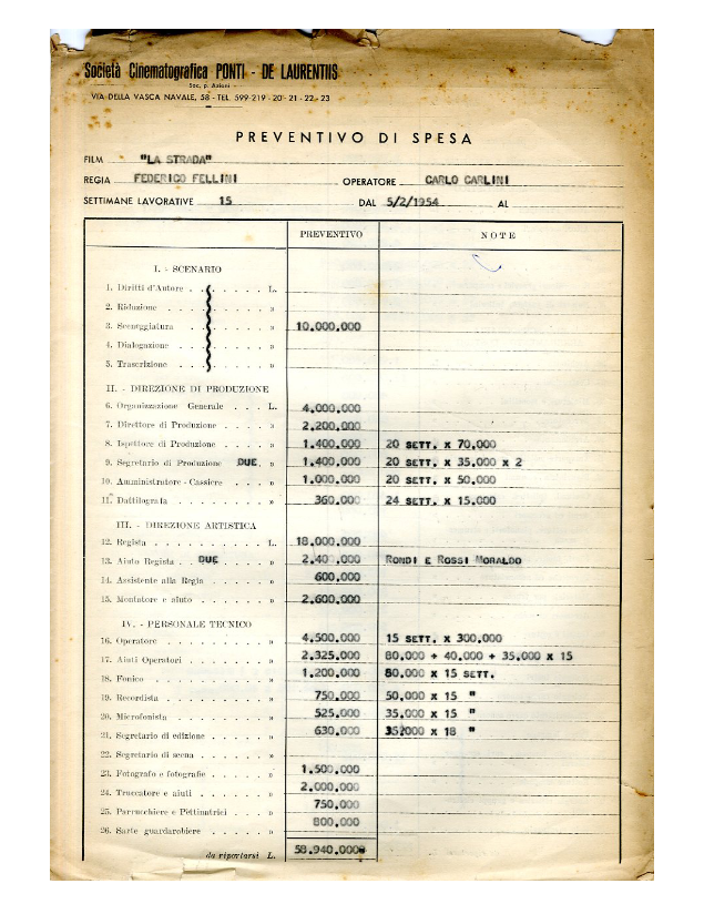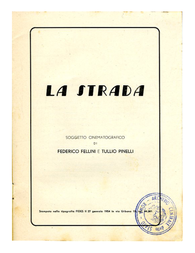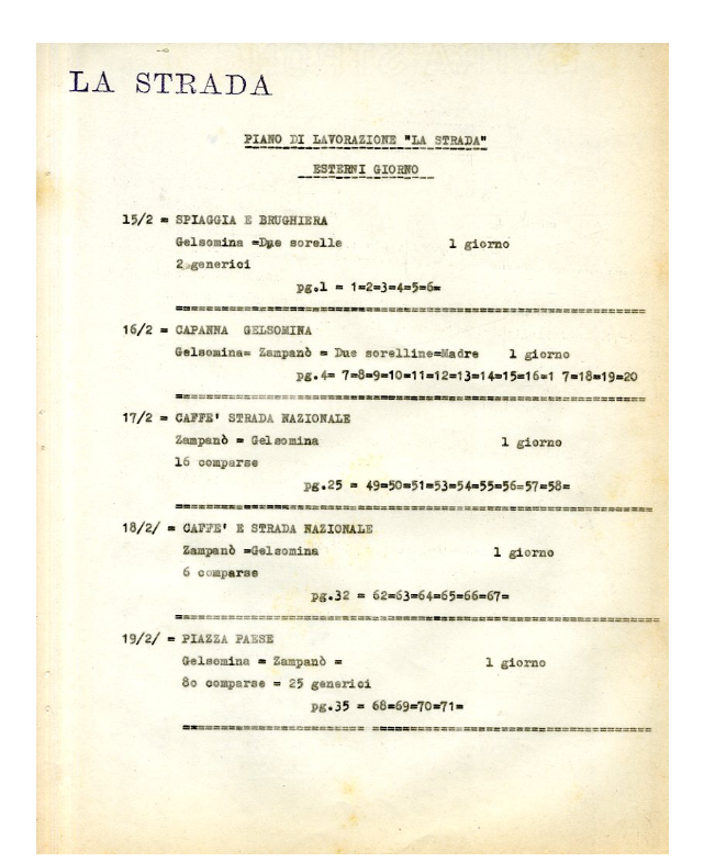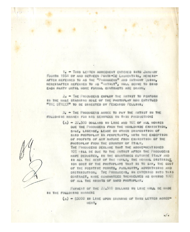 La copia della lettera di Quinn al regista e a Masina è parte del materiale presente nell’archivio della Cineteca, trasmesso dall’Archivio di Stato che custodisce una infinita testimonianza delle documentazioni, dei testi e delle immagini che erano e sono tutt’ora necessari alle produzioni cinematografiche: dai soggetti ai preventivi, dai piani di lavorazione alle richieste di autorizzazione. Un modo quindi per compiere una vera e propria immersione nella dimensione ‘produttiva’ della settima arte, a disposizione negli archivi comunali. Tra i documenti ad esempio, soffermandosi su La Strada, si può trovare il soggetto cinematografico, il preventivo di spesa con tutti i costi relativi alle 15 settimane di lavorazione preventivate. Non manca infine il segno del Maestro: uno schizzo di Gelsomina, realizzato con una biro blu, così essenziale eppure già così denso di contenuto.