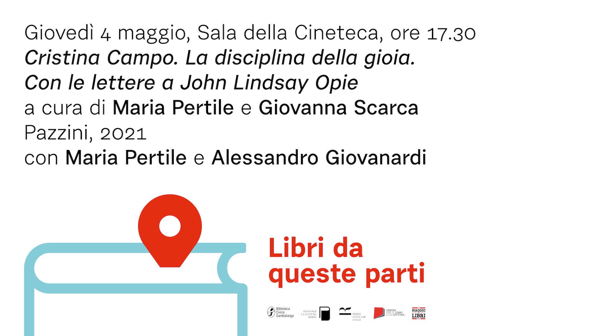 Ad inaugurare il programma di maggio di “Libri da queste parti” che si pone sotto l’insegna della campagna nazionale “Il Maggio dei Libri”, sarà giovedì 4 maggio ore 17.30 nella sala della Cineteca comunale, la figura di Cristina Campo, una delle voci più intense e raffinate della letteratura del Novecento, poetessa, saggista, traduttrice di Simone Weil, Dickinson, Eliot, John Donne, W.C. Williams, Hoffmannsthal e di altri poeti metafisici e mistici. Nel centenario della nascita (era nata a Bologna il 29 aprile 1923, nome all’anagrafe Vittoria Guerrini) la riscopriamo attraverso il volume “Cristina Campo. La Disciplina della Gioia”, a cura di Maria Pertile e Giovanna Scarca, con le Lettere a John Lindsay Opie, a cura di Alessandro Giovanardi, pubblicato dall’editore Pazzini nel 2021. Il libro raccoglie gli atti del Convegno tenuto a Firenze nel 2017 in occasione del quarantesimo della morte (Roma, 1977) e contribuisce a portare a conoscenza del grande pubblico una delle figure più straordinarie del Novecento letterario italiano ed europeo.