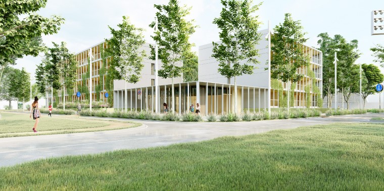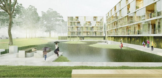 Il complesso sarà in dialogo con lo spazio esterno: una grande corte verde ribassata e protetta, attraversata da percorsi ciclabili e pedonali che accoglierà spazi dedicati ai giochi e attrezzature per lo svago. Oltre ad essere area pubblica e di condivisione polifunzionale, la corte funzionerà anche come grande rain-garden permettendo una migliore gestione dei fenomeni atmosferici estremi e comprendendo la vasca di laminazione ancora in funzione. Saranno adottate strategie e tecnologie con l’obiettivo di costruire uno spazio pubblico resiliente e sostenibile, anche nei confronti dei cambiamenti climatici (isola di calore, gestione delle acque meteoriche, comfort acustico, illuminazione LED alimentata dai pannelli fotovoltaici dell’edificio).