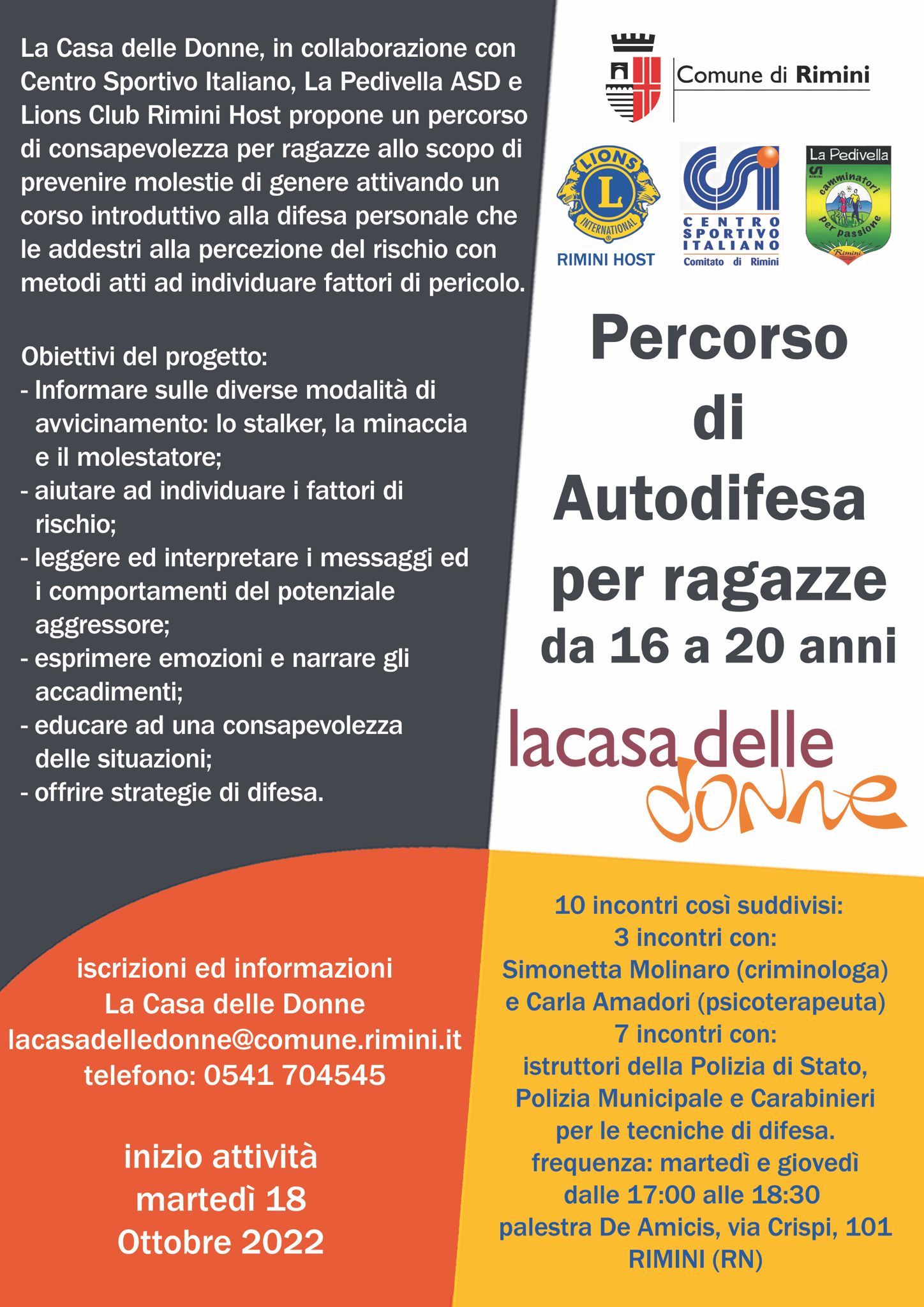 Partirà martedì il 18 ottobre il corso 2022 di autodifesa - dedicate a ragazze dai 16 ai 20 anni - organizzato dalla Casa delle Donne in collaborazione con Centro sportivo italiano, La Pedivella, ASD e Lions club Rimini Host. Il corso vedrà anche la partecipazione dell’Arma dei Carabinieri, Polizia di Stato e Polizia Municipale che mettono a disposizione gratuitamente propri istruttori.