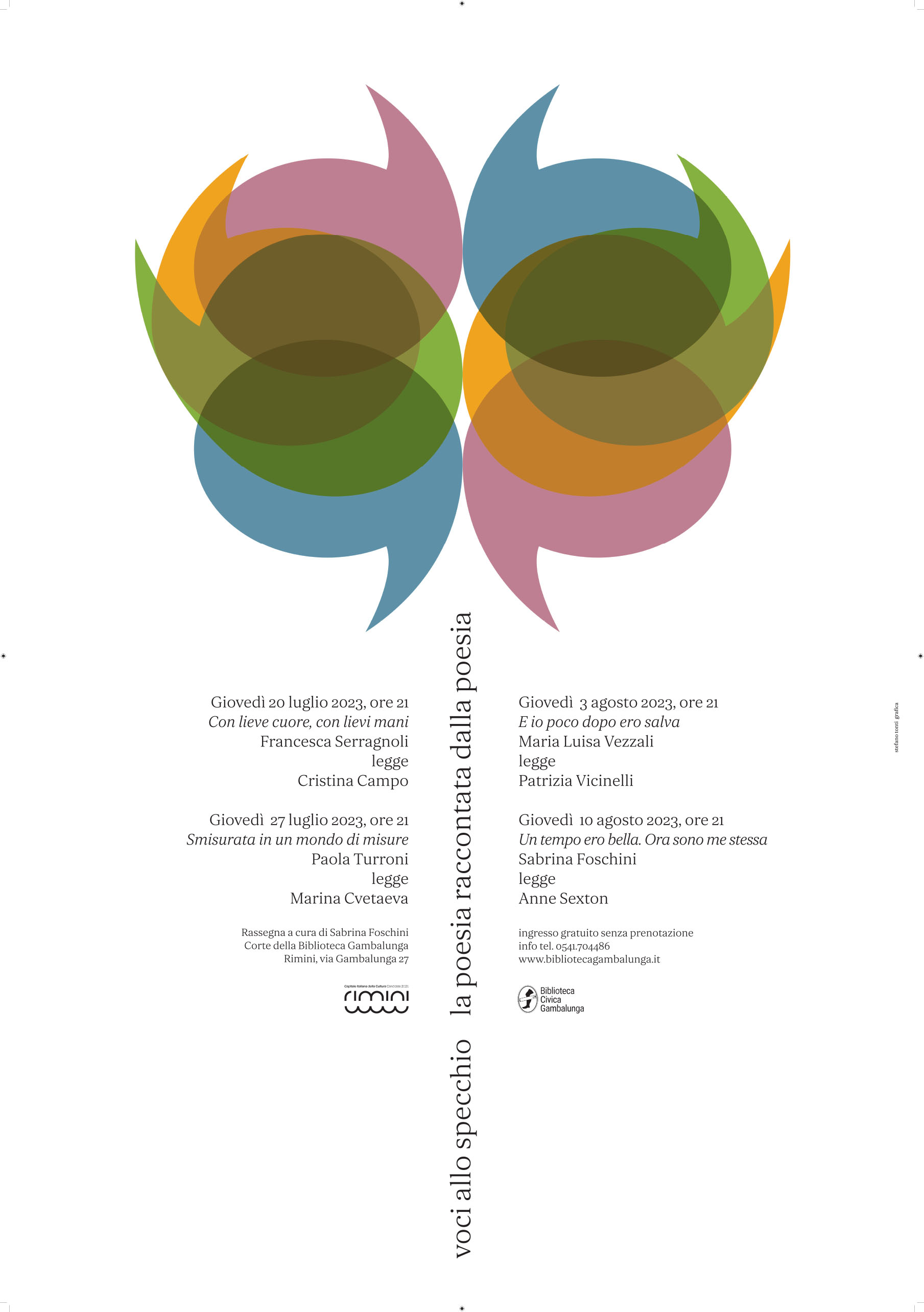 “Voci allo specchio” è una piccola rassegna poetica promossa dalla Biblioteca Civica Gambalunga di Rimini, che verrà proposta nella corte di palazzo Gambalunga ogni giovedì sera dal 20 luglio al 10 agosto. Dà forma a un’idea di Sabrina Foschini nata dalla convinzione che soltanto la passione possa veicolare e trasmettere la bellezza e per questo, la strada più diretta per comprendere le grandi voci del passato, può passare dalla bocca di poetesse contemporanee. I versi e le parole amate riverberano e risuonano in chi le ha fatte proprie nello studio, nel confronto, nell’ammirazione critica e costante, avendo scelto a sua volta la poesia come mezzo espressivo. Quattro grandi voci del passato, due italiane e due straniere, una russa e una statunitense, si rispecchiano nel ritratto e nella lettura delle autrici dei nostri giorni, capaci di contagiare il pubblico con la loro consapevole passione. Della luminosa Cristina Campo, bolognese di nascita ma di padre romagnolo quest’anno ricorre il centenario della nascita. Marina Cvetaeva e Anne Sexton rappresentano due vertici differenti della poesia amorosa del Novecento. Patrizia Vicinelli perfetta incarnazione di vita e opera è stata un’artista capace di spaziare dalla poesia sperimentale e visiva al teatro e alla performance, pagando ogni scelta sulla propria pelle. Voci potentemente femminili allo specchio del nostro tempo, nella lettura innamorata di Francesca Serragnoli. Paola Turroni, Maria Luisa Vezzali e Sabrina Foschini, che scelgono di non presentare la propria poesia ma quella che da sempre le ha attraversate e formate.