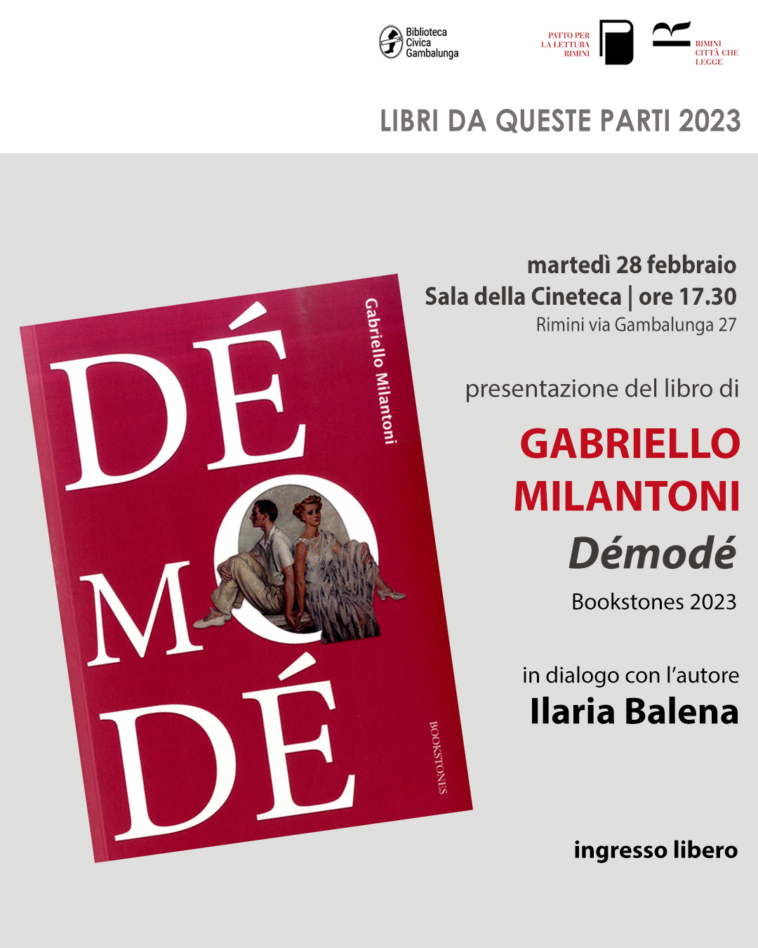 Sempre in sala della Cineteca continuano gli appuntamenti della Biblioteca con Libri da queste parti, la rassegna di incontri dedicata agli autori del territorio, che vede martedì 28 febbraio, Gabriello Millantoni, che presenta il libro 'Demodé, Bookstones 2023' in dialogo con Ilaria Balena e giovedì 2 marzo Angelo Turchini con il libro 'La Romagna nello Stato Pontificio, in dialogo con Marzio Casalini.