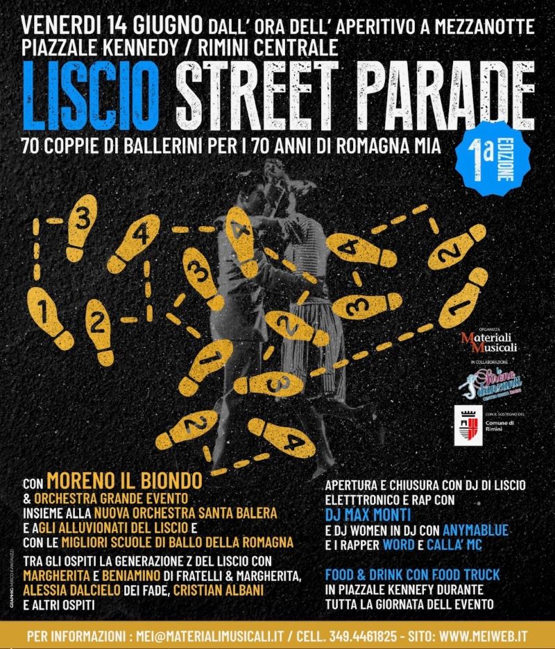 Una serata dedicata al Liscio, a due passi dal mare, per i 70 anni di 'Romagna mia'. 70 coppie di ballerini delle migliori scuole di ballo della Romagna insieme agli Alluvionati del Liscio animano il Belvedere di Piazzale Kennedy al ritmo della musica di Moreno il Biondo & l'Orchestra Grande Evento insieme alla nuova Orchestra Santa Balera, orchestra di giovanissimi del liscio, ospiti lo scorso febbraio al Teatro Ariston durante il Festival di Sanremo. Tra gli ospiti la Generazione Z del Liscio con Margherita e Beniamino di Fratelli & Margherita, Alessia Dalcielo dei Fade, Cristian Albani e altri. L'apertura e la chiusura della serata è affidata a Dj di Liscio elettronicoe rap con Dj Max Monti e Dj Women in Dj con Anymablue e i rapper Word e Callà MC.