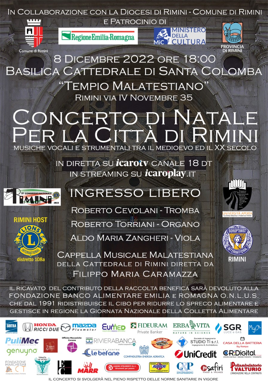 La Basilica Cattedrale di Santa Colomba 'Tempio Malatestiano' ospita il “Concerto di Natale per la Città di Rimini”, giunto quest'anno alla sesta edizione. Il concerto avrà come protagonisti: la Cappella Musicale Malatestiana diretta dal M° Filippo Maria Caramazza, che vanta prestigiose direzioni in importanti festival europei e composizioni sinfoniche e da camera, e i musicisti: Roberto Cevolani (tromba) Roberto Torriani (organo) ed Aldo Maria Zangheri (viola) che eseguiranno musiche vocali e strumentali tra il medioevo ed il XX secolo.