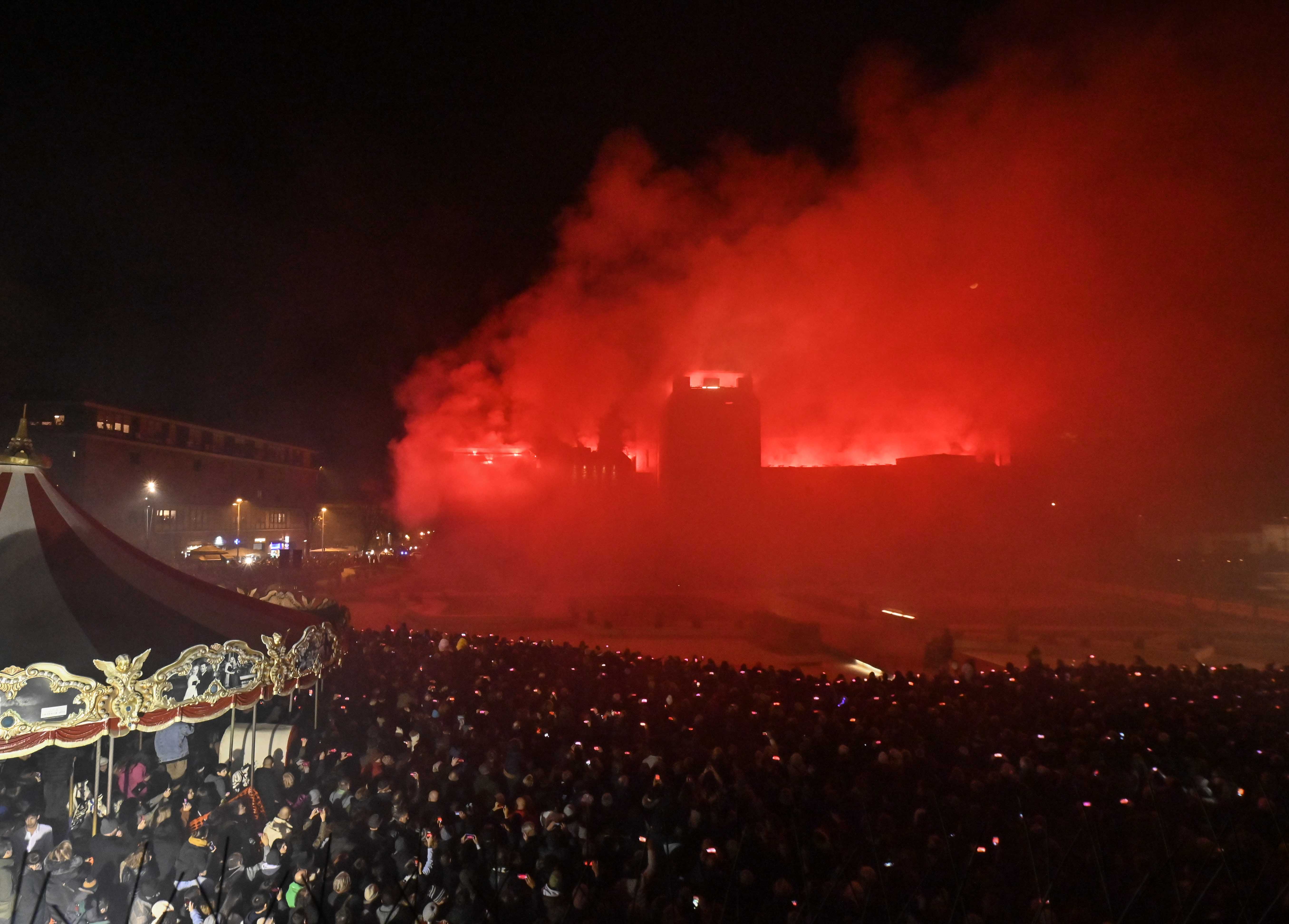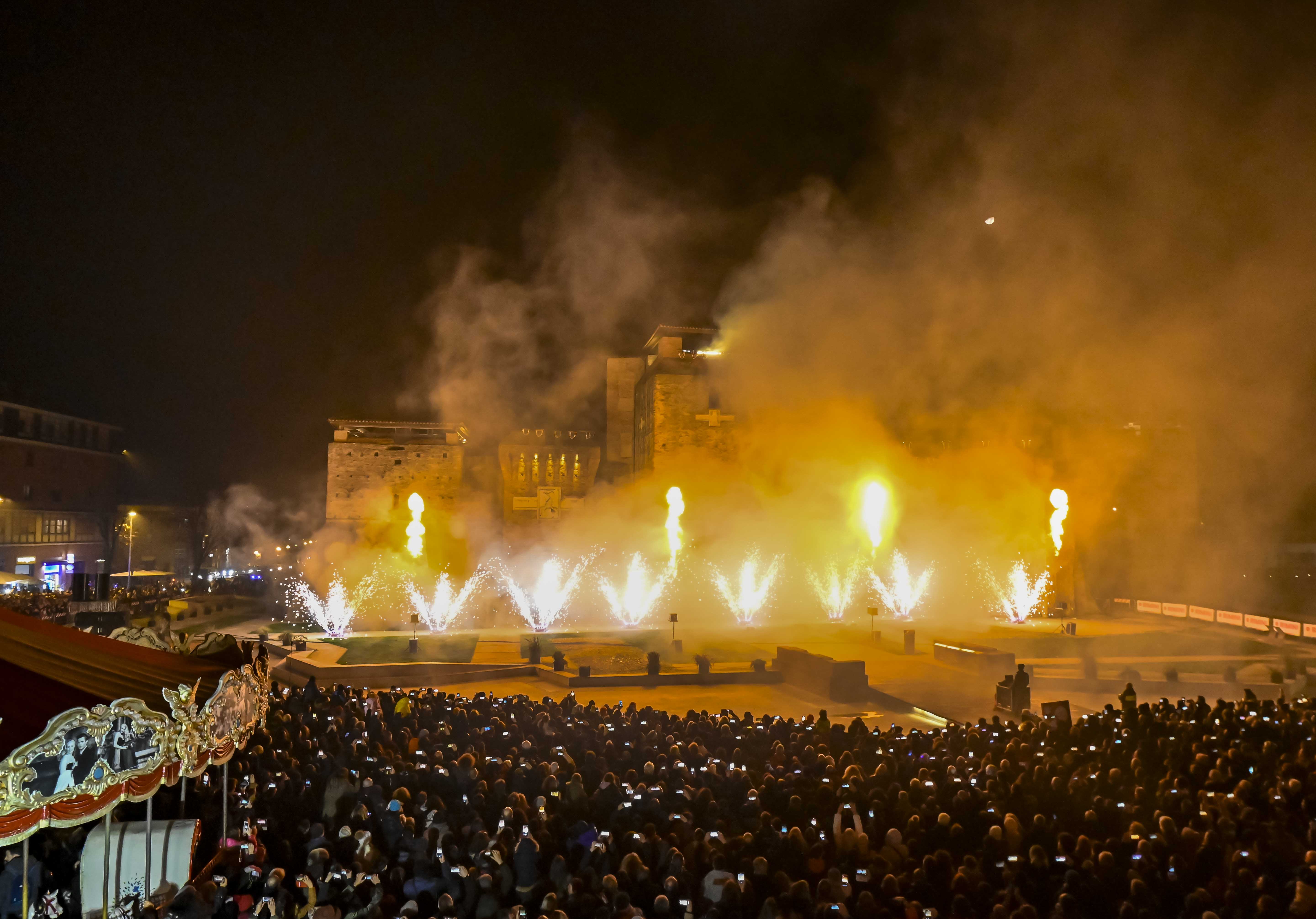 La magia ha conquistato la piazza per il momento più atteso, quello con il doppio spettacolo dell’incendio al Castello, che ha consentito, in due momenti diversi e da più punti della piazza, di iniziare l’anno immersi nel sogno fuori dal tempo con mille luci e cento diversi effetti di fuochi e scie luminose.