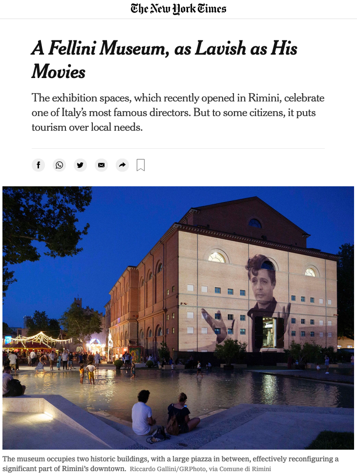 Il sito del quotidiano americano, con 70 milioni di accessi mensili, ha posto la lente d’ingrandimento sul nuovo sito museale con un ampio articolo a firma di Barbara Povoledo. Un vero omaggio al celebre regista e alla sua città, con il racconto delle singole sale allestite nella cornice rinascimentale di Castel Sismondo, arricchito dall’elenco dei film che hanno reso celebre il regista vincitore di 5 Premi Oscar, e da diverse interviste ai curatori e ai personaggi che hanno fatto parte del progetto. L’articolo sottolinea anche la modernità insita nel Museo, grazie alle installazioni e agli schermi interattivi che offrono i giusti spunti, secondo la testata americana, anche a quel pubblico che è troppo giovane per aver visto i film di Fellini nelle sale cinematografiche.