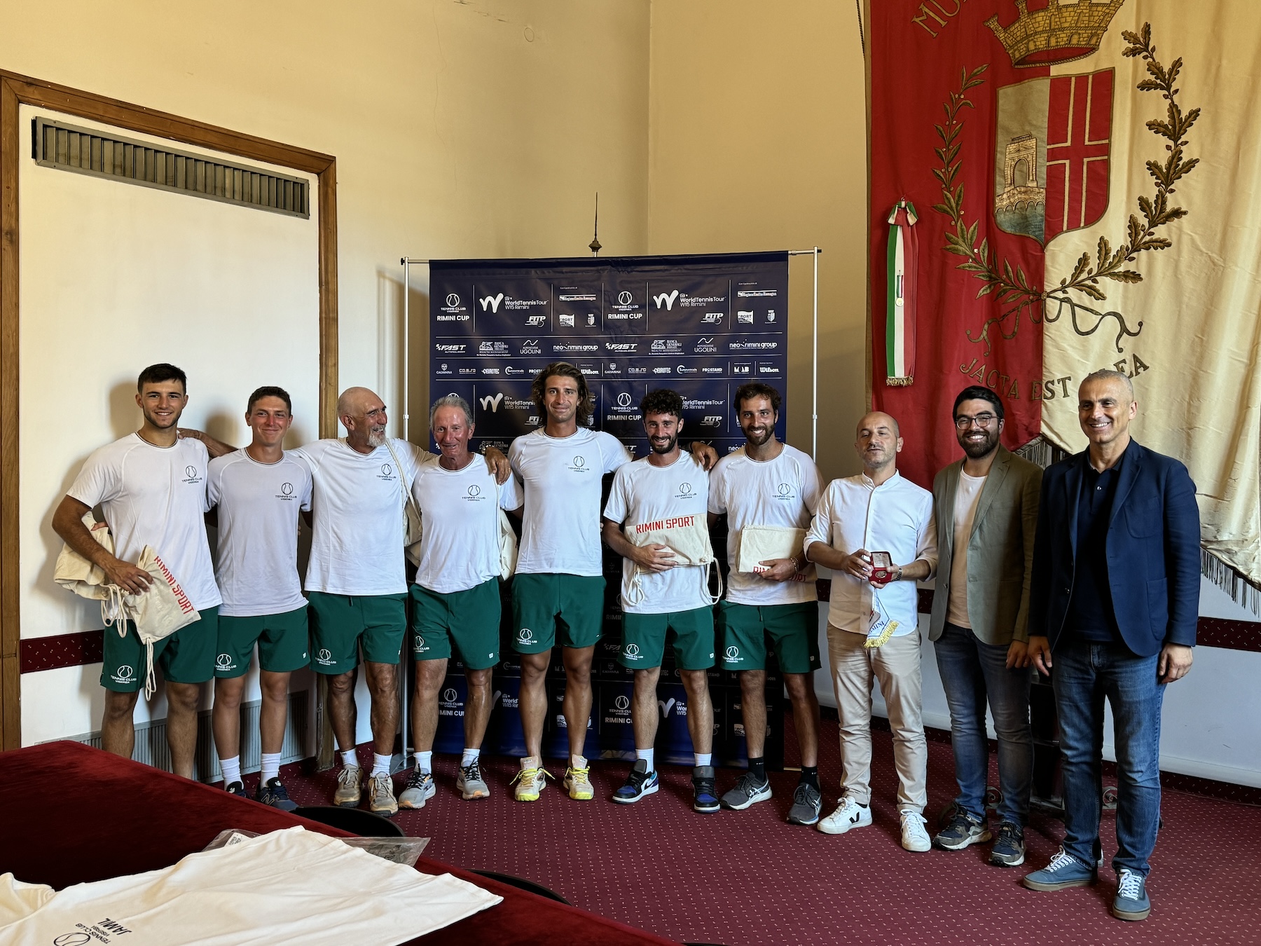 VISERBA. Una festa doppia per il tennis riminese oggi in Residenza Comunale: in Sala Giunta il sindaco Jamil Sadegholvaad e l’assessore allo sport, Michele Lari, hanno ricevuto e premiato la squadra del Tennis Club Viserba che pochi giorni fa ha conquistato la promozione in A2 ed inoltre è stato presentato il ritorno del grande tennis in citta, con la “Rimini Cup”, torneo Itf Women’s Tour femminile (15.000 dollari di montepremi) ormai ai nastri di partenza sempre sui campi del Tennis Club Viserba.