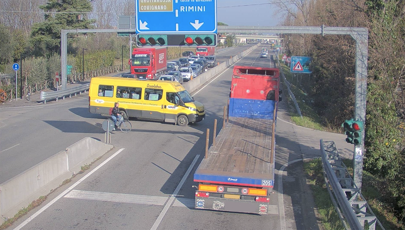 E’ una sequenza di scatti da brividi quelli eseguiti automaticamente, lo scorso 12 gennaio in pieno giorno, dall’apparecchiature per rilevamento del transito con semaforo rosso, posizionata nell’incrocio tra la Statale 72 (Rimini-San Marino) e le vie Gazzella e Barattona. Una scena molto pericolosa che ritrae, intorno alle ore 13, da un parte uno scuolabus pieno di bambini e dall’altra un autocarro che con il suo rimorchio ha proceduto dritto in direzione mare, nonostante che il semaforo posto sulla statale emettesse la luce rossa.