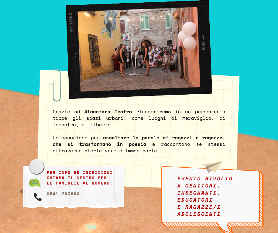 Continua il ciclo di appuntamenti con il percorso “Adolescenti e genitori: Nuove Connessioni Possibili”, organizzato dal Centro per le Famiglie in collaborazione con Alcantara Teatro e promosso dall'Assessorato alla Scuola e alle Politiche educative del Comune di Rimini.
