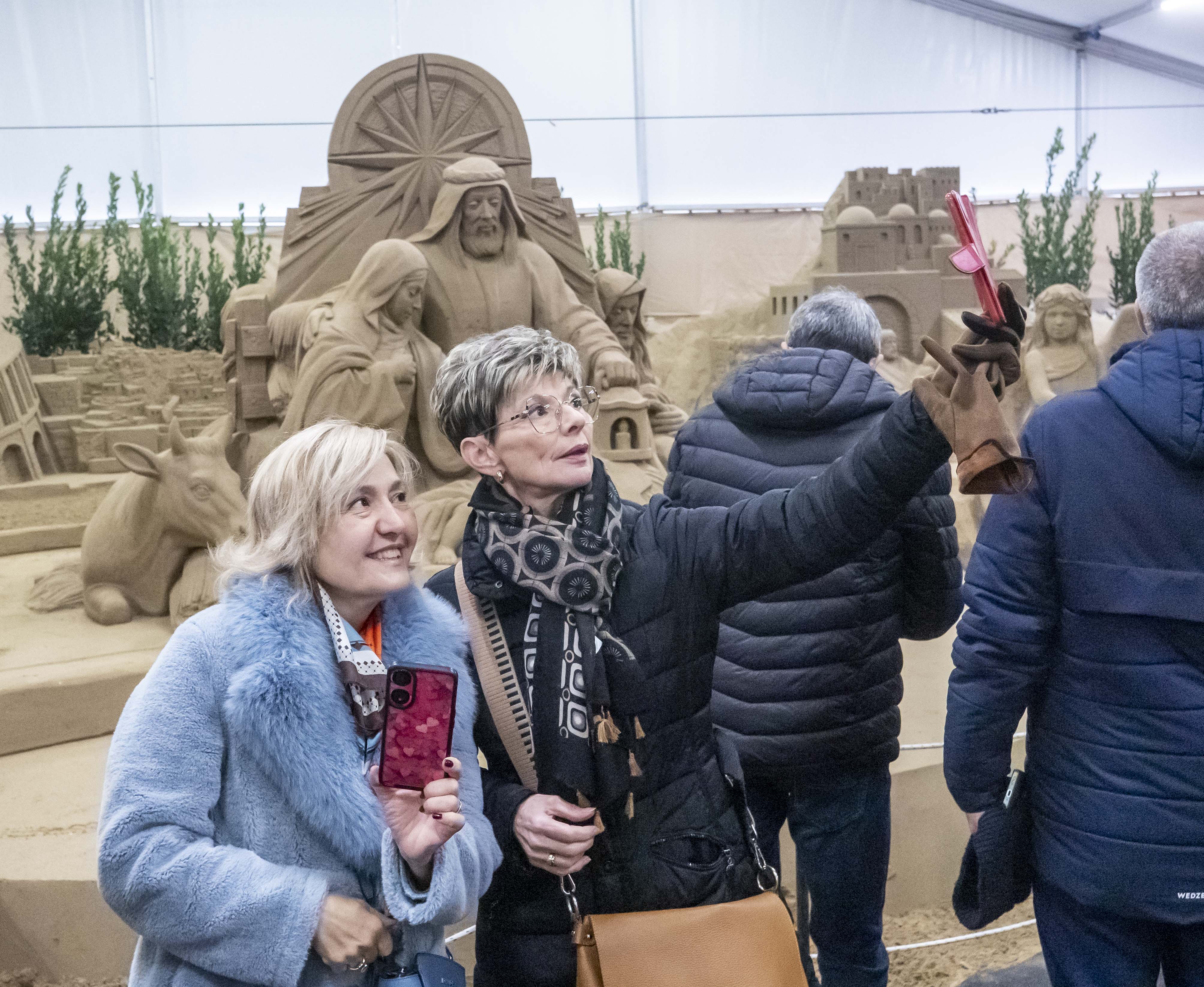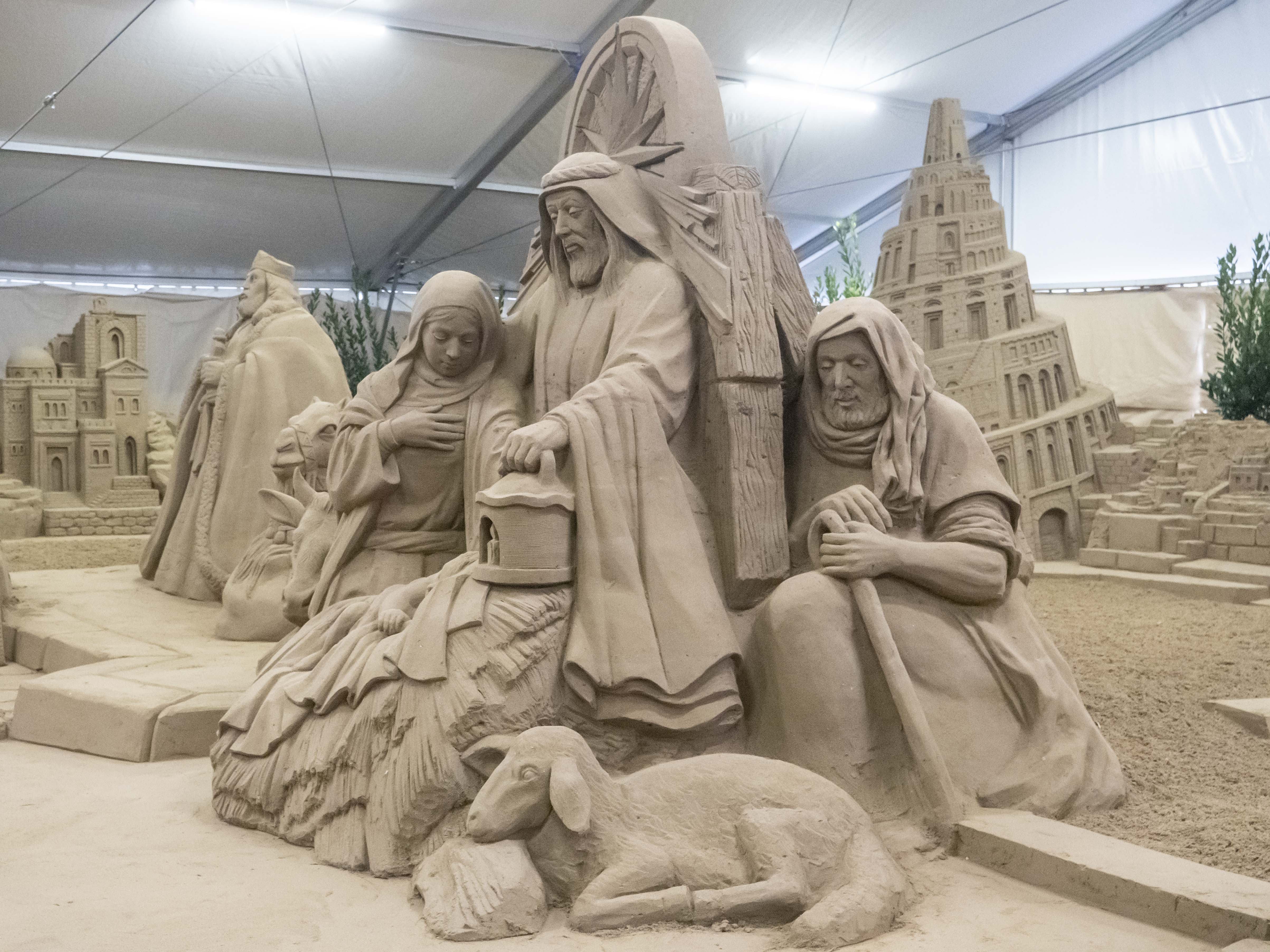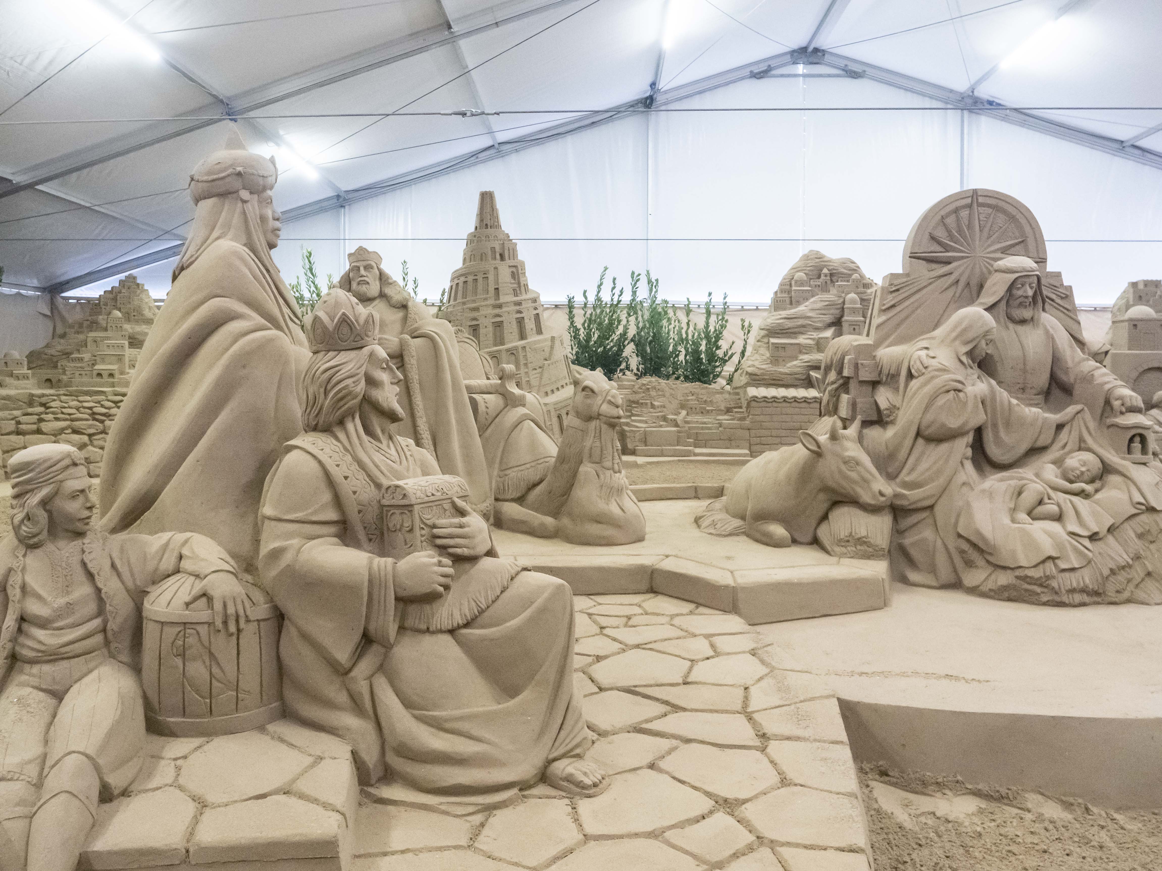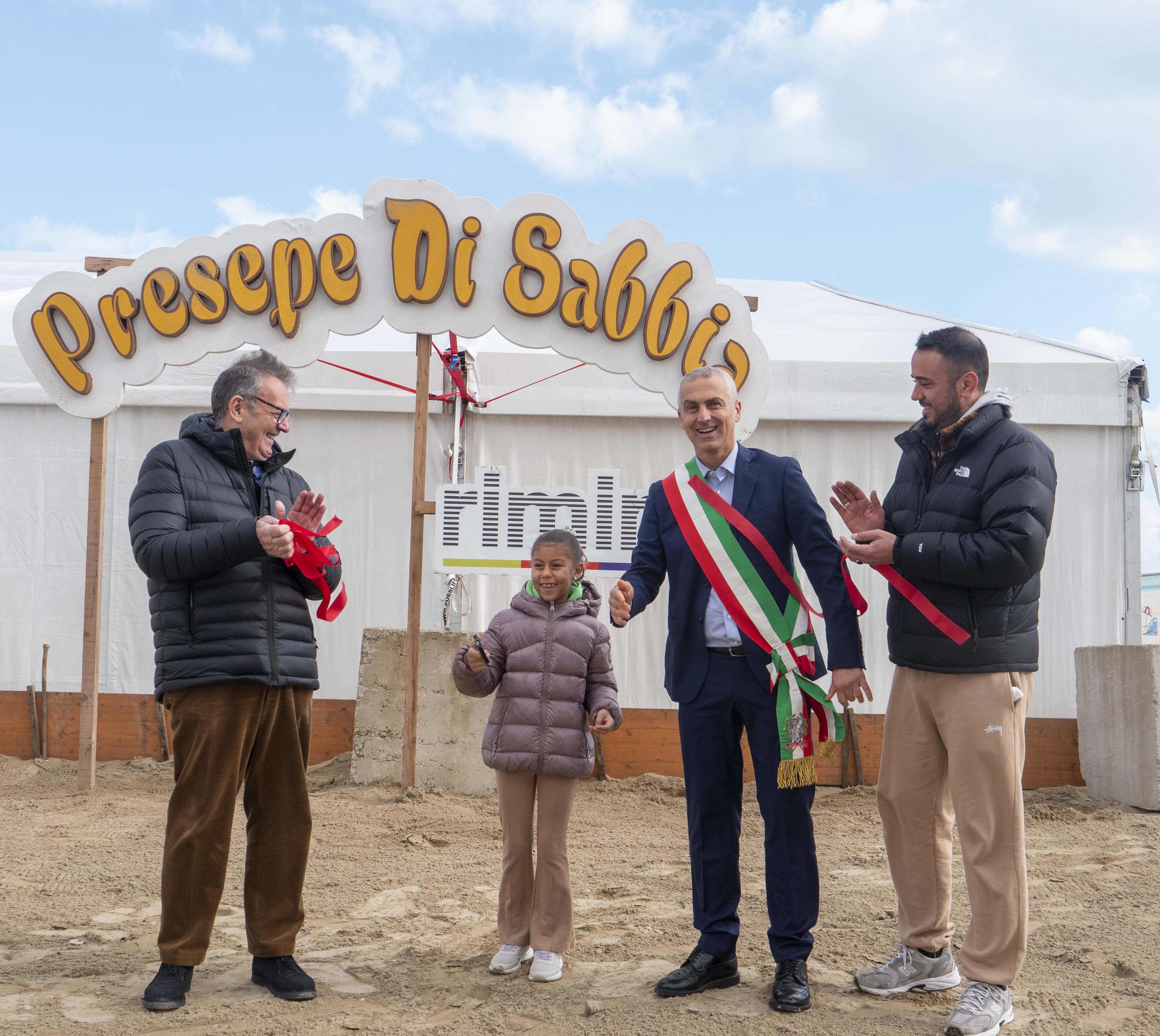 Inaugurato il grande presepe di sabbia sulla spiaggia libera di Marina Centro che apre da oggi ufficialmente al pubblico insieme al Villaggio di Natale, alla pista di ghiaccio e alla passeggiata sulle dune con le panchine illuminate lungo tre chilometri di spiaggia dal bagno 1 al 63. Un viaggio indietro nel tempo, quello creato dagli artisti della sabbia, che riporta alla Betlemme di Giudea di duemila anni fa. Un'opera che raffigura la Natività, i Re Magi e le scene di vita quotidiana, tutto realizzato con la sola sabbia e l'acqua del mare. E per i più piccoli, una sorpresa speciale: un presepe tutto dedicato a loro, con i personaggi dei loro fumetti preferiti.