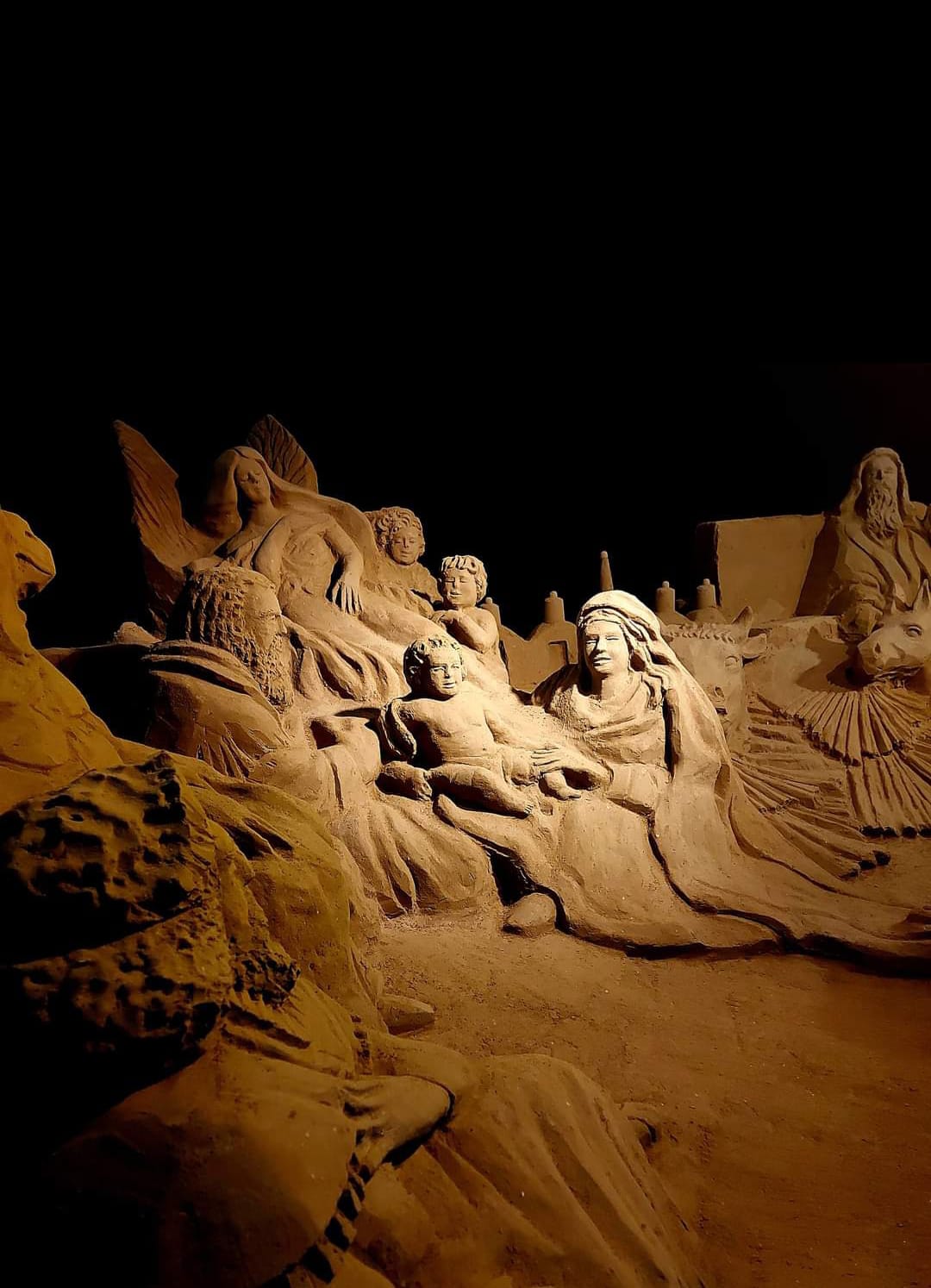 All’interno dell’Ice Village, un Villaggio di Natale tutto al coperto a due passi dal mare, una tensostruttura accoglie il Presepe di sabbia, che quest’anno torna alla tradizione classica napoletana con sculture di sabbia giganti create con maestria da un team internazionale di artisti della sabbia. La Natività con i pastori, gli animali e la vita del villaggio con artigiani e negozianti danno vita a scenografici gruppi scultorei, dove ogni gesto ed espressione delle figure rappresentate esprimono gioia e felicità portando con sè un messaggio di Amore, Serenità e Gioia, per riportarci a riscoprire l'amore e la generosità gli uni verso gli altri.