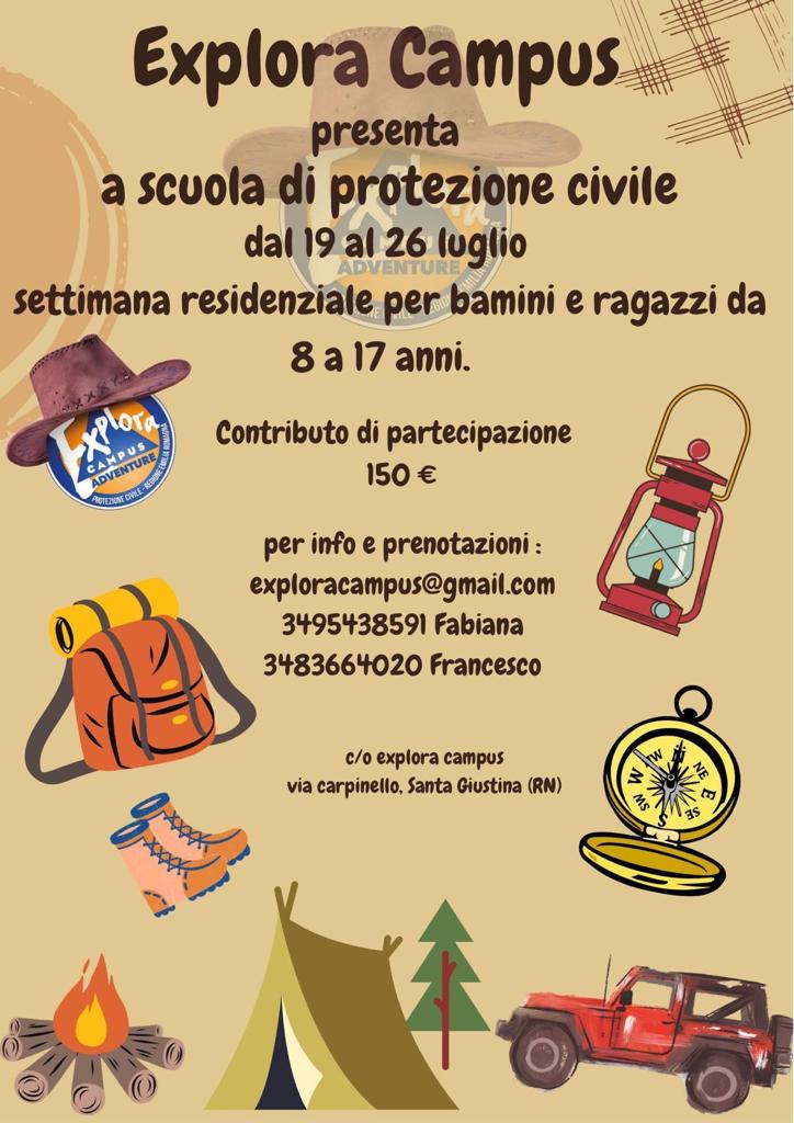 Sono oltre 270 i campi scuola attivati su tutto il territorio nazionale. In provincia di Rimini è attivato a cura dell'associazione Explora Campus, il centro in via Carpinello a Santa Giustina di Rimini, con un percorso formativo che si svolge dal 19 luglio al 26 luglio che si articola su più livelli facendo interagire i giovani partecipanti con le attività proprie di "chi fa" protezione civile, stimolando consapevolezza di un proprio ruolo attivo e partecipativo.