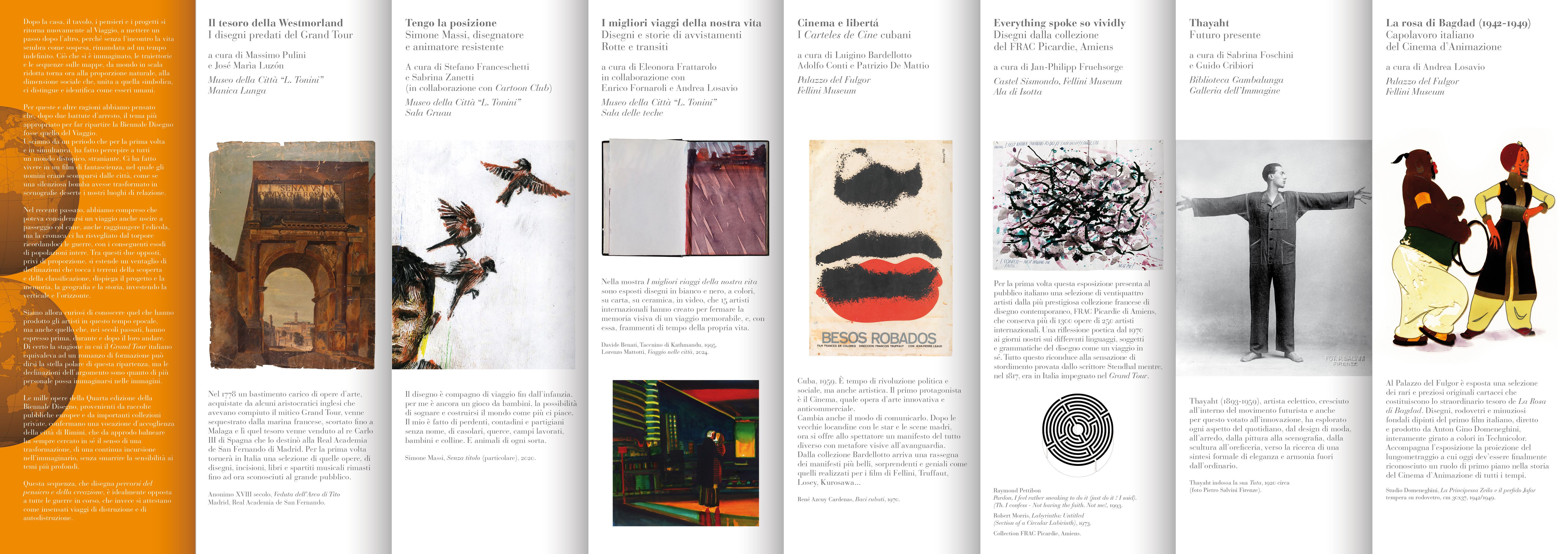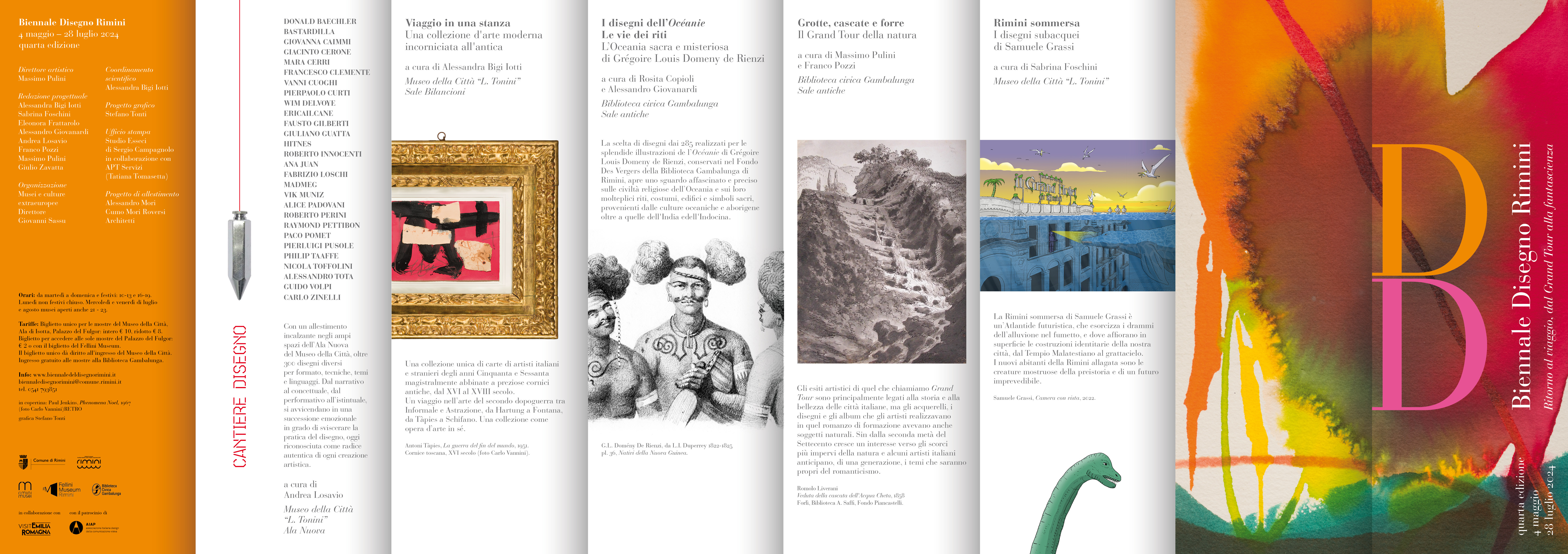 Quarta edizione della Biennale del Disegno di Rimini, organizzata e curata dall’Assessorato alla Cultura e dai Musei Comunali di Rimini, che torna a svolgersi, dopo la pausa causata dal Covid-19, come di consueto tra la primavera e l’estate con il suo format consolidato di mostre dislocate dislocate nelle diverse sedi istituzionali - Museo della Città, Biblioteca Gambalunga, Palazzo del Fulgor e Castel Sismondo – e con il Circuito Open, espressione del dialogo diretto e interagente con la città e il suo territorio, che comprende altre esposizioni in spazi privati e pubblici (gallerie, studi d’artisti e d’architettura, librerie). Saranno 12 le mostre in contemporanea ad esporre 1.000 disegni che provengono da importanti istituzioni internazionali, come, tra le altre, l’Accademia Reale di San Fernando di Madrid e i Fonds Regionale d’Art Contemporain de Picardie, e da collezioni private come lo Studiolo Rivi. Tema il Viaggio come esito e ispirazione, ma anche come registrazione e contaminazione dal presente al passato. In mostra disegni che spaziano dai taccuini di viaggio di Felice Giani a quelli di Lorenzo Mattotti, dalle incisioni di Piranesi al Novecento di Thayaht, da Morandi a Fontana e Fautrier, dai Carteles del cinema cubano ai disegni del primo film d’animazione italiano “La Rosa di Bagdad” per giungere agli artisti contemporanei in mostra nel Cantiere Disegno.