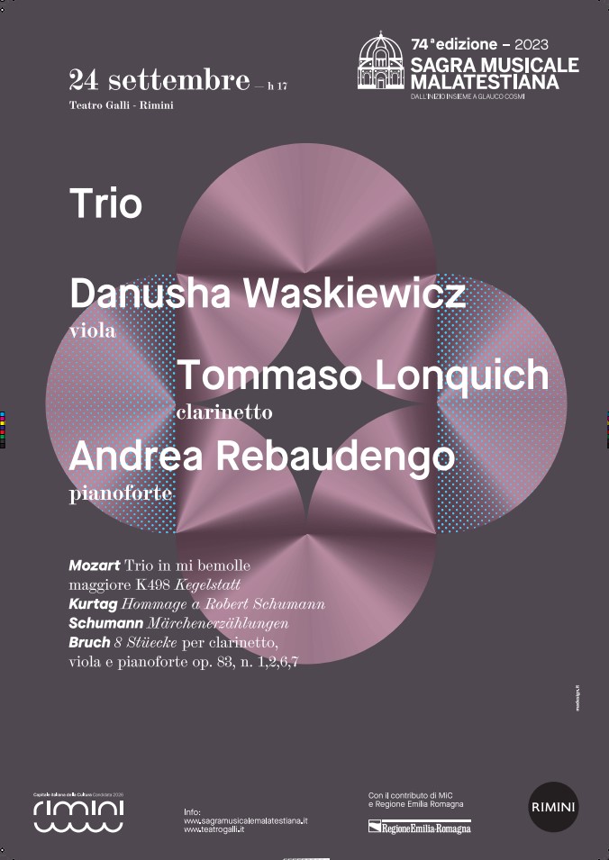 Prende avvio domenica 24 settembre - ore 17 – il ciclo di musica da camera della 74esima Sagra Musicale Malatestiana. Alla Sala Ressi del Teatro Galli si alterneranno la violista Danusha Waskiewicz, il clarinettista Tommaso Lonquich e il pianista Andrea Rebaudengo in un originale itinerario che da Mozart si spinge fino al Novecento di Kurtág. Si parte con il celebre Trio mozartiano detto dei Birilli per toccare il romanticismo con le otto Märchenerzählungen di Robert Schumann e i pezzi per clarinetto viola e pianoforte di Max Bruch e il Novecento con l’ Hommage à Robert Schumann composto dall’ungherese György Kurtág