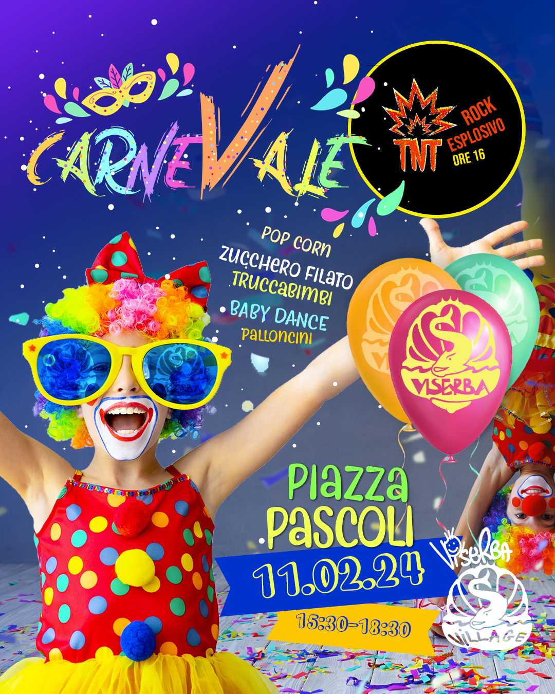 Un pomeriggio di allegria con la tradizionale festa di carnevale a Viserba. La piazza si anima con musica, giochi, truccabimbi e palloncini per tutti i bambini presenti. Non mancheranno gli stand gastronomici con zucchero filato, cioccolato, pop-corn e tanto altro. Alle ore 16, TNT in concerto. Tre giovanissimi musicisti portano in piazza l'energia incontenibile del rock.