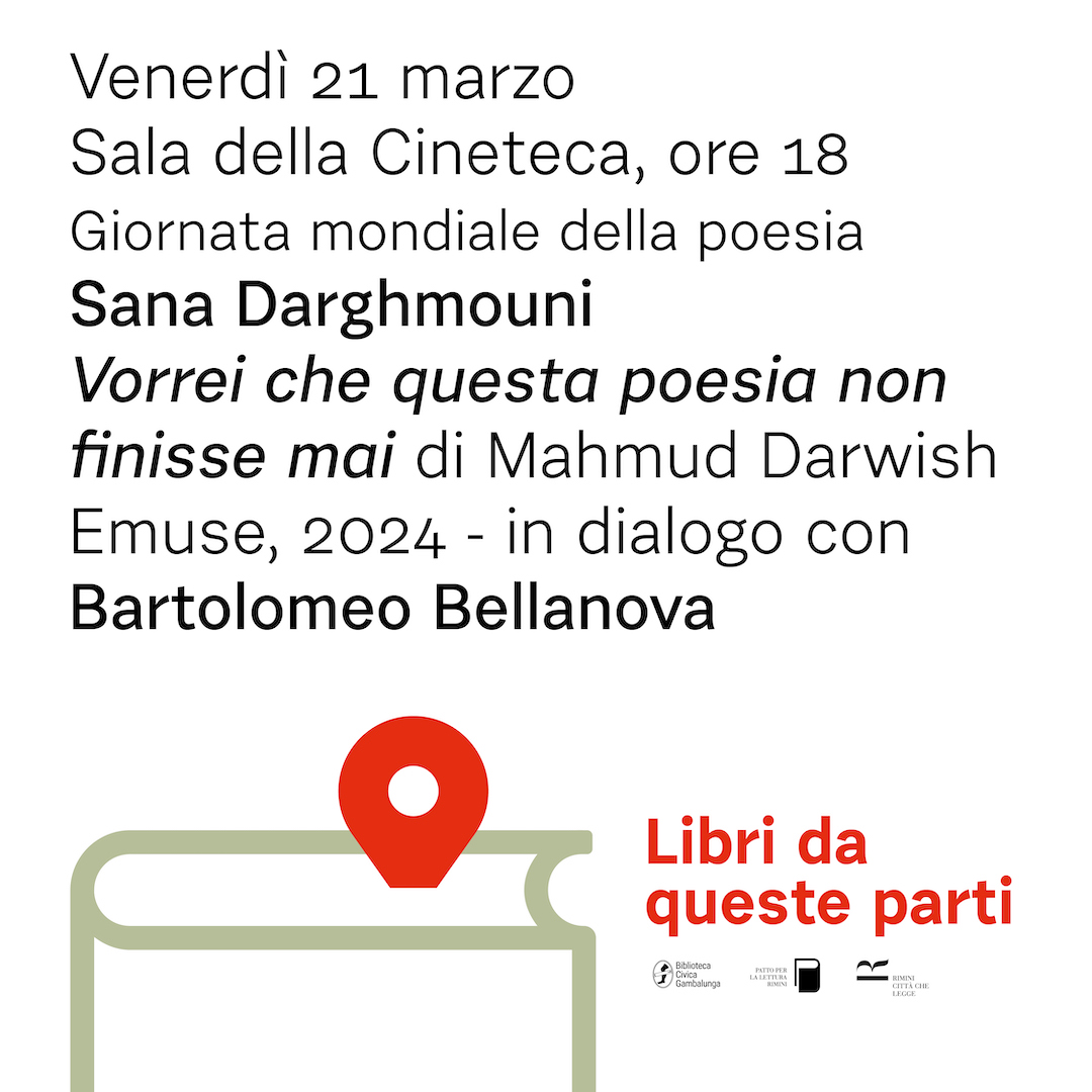 In occasione della Giornata mondiale della poesia, alla rassegna "Libri di queste parti" si celebra la poesia come strumento di memoria e narrazione attraverso la voce di Mahmud Darwish , poeta e scrittore arabo palestinese (al-Birwa 1941 - Houston 2008), considerato il poeta nazionale palestinese e uno tra i più importanti poeti in lingua araba del Novecento. Venerdì 21 marzo alle ore 18, presso la Sala della Cineteca, la traduttrice Sana Darghmouni presenterà la prima edizione italiana di Vorrei che questa poesia non finisse mai , l’ultima raccolta poetica di Mahmud Darwish, pubblicata postuma nel 2009.