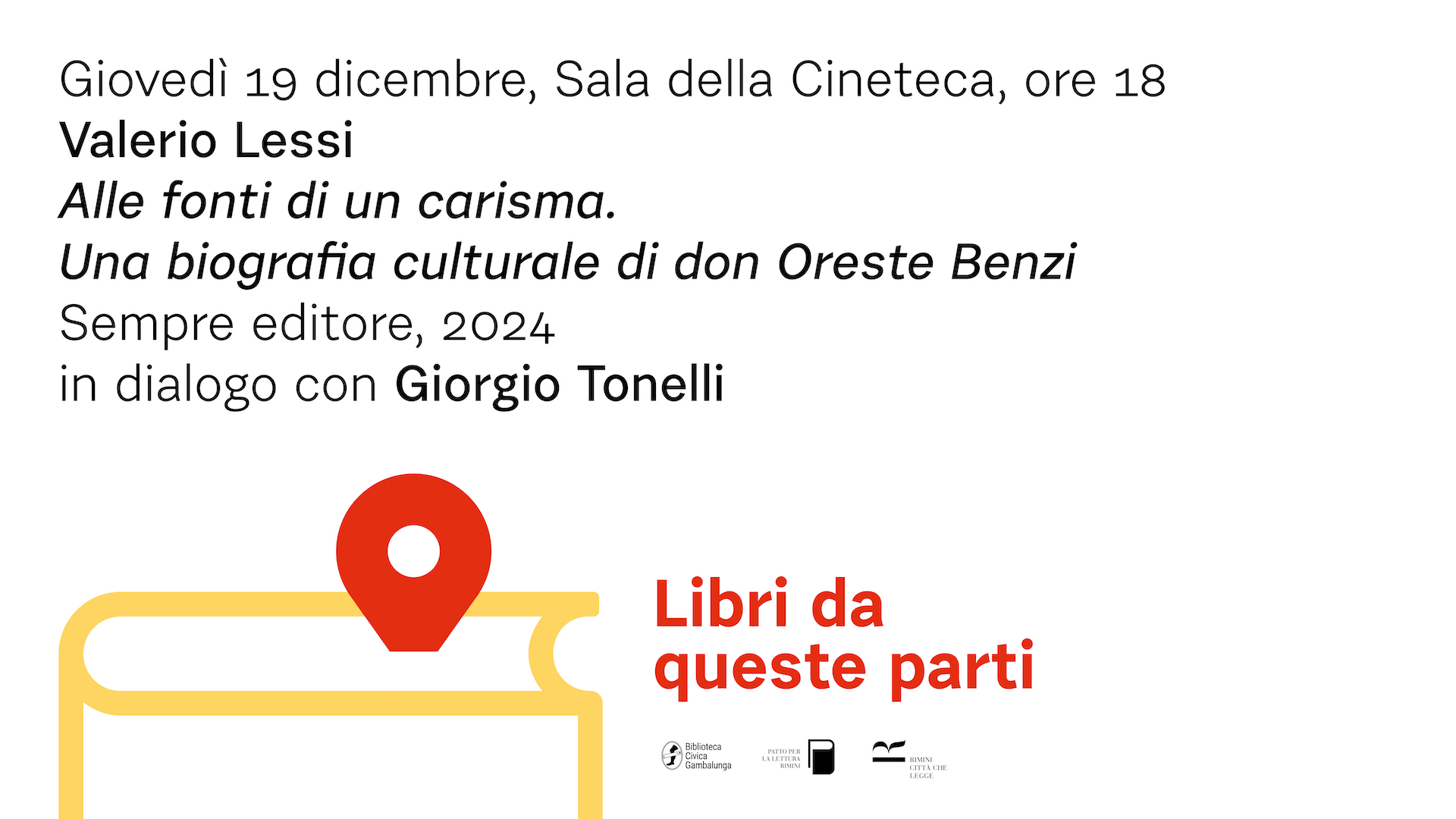 L’ultimo appuntamento dell’anno di “Libri da queste parti” ha per protagonista il giornalista e scrittore Valerio Lessi e la sua biografia culturale di don Oreste Benzi. Il libro Alle fonti di un carisma. Una biografia culturale di don Oreste Benzi, pubblicato nel 2024 da Sempre editore sarà presentato giovedì 19 dicembre (Sala Cineteca ore 18), in una conversazione tra l’autore e il giornalista Giorgio Tonelli.