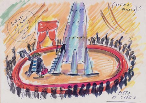 E ancora il progetto di un film su Dante, il sogno di tutti i produttori americani: Fellini che rifà La Divina Commedia. Fellini ci scherza e imbastisce una scaletta (all. 6) per uno special sull’Inferno. Schizza anche qualche disegno (all. 1) e affida al fidato Antonello Geleng la realizzazione di alcuni bozzetti scenografici (all. 5).