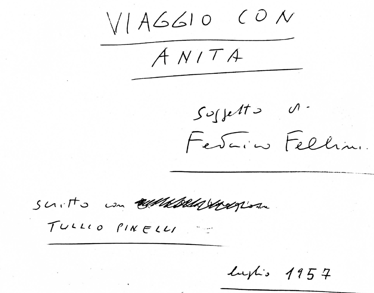 Se la filmografia di Fellini è studiata in tutto il mondo, molto meno conosciuti sono i diversi lavori iniziati dal regista ma mai portati a termine, ciascuno con un proprio stadio di avanzamento, e di cui testimonianze e tracce sono custodite nell’archivio del Fellini Museum. Se ad esempio sono noti come grandi ‘incompiuti’ Il viaggio di G. Mastorna (di cui esiste un’ampia documentazione tra testi, foto e disegni) (allegato 7) e Viaggio a Tulum, entrambi poi trasposti in fumetto da Milo Manara, non altrettanto si può dire di Viaggio con Anita, film di cui Fellini scrisse il soggetto (all. 4) e che fu affidato, vent’anni dopo e con poca fortuna, alla regia di Mario Monicelli.
