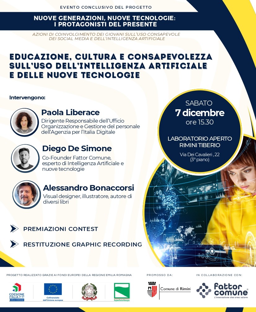 Sabato 7 dicembre, dalle ore 15.30 alle 17.00, al Laboratorio Aperto Rimini Tiberio si terrà l'appuntamento di chiusura del progetto ‘Nuove generazioni, nuove tecnologie: i protagonisti del presente’ promosso dal Comune di Rimini, in collaborazione con Fattor Comune e finanziato grazie a fondi europei della Regione Emilia-Romagna.