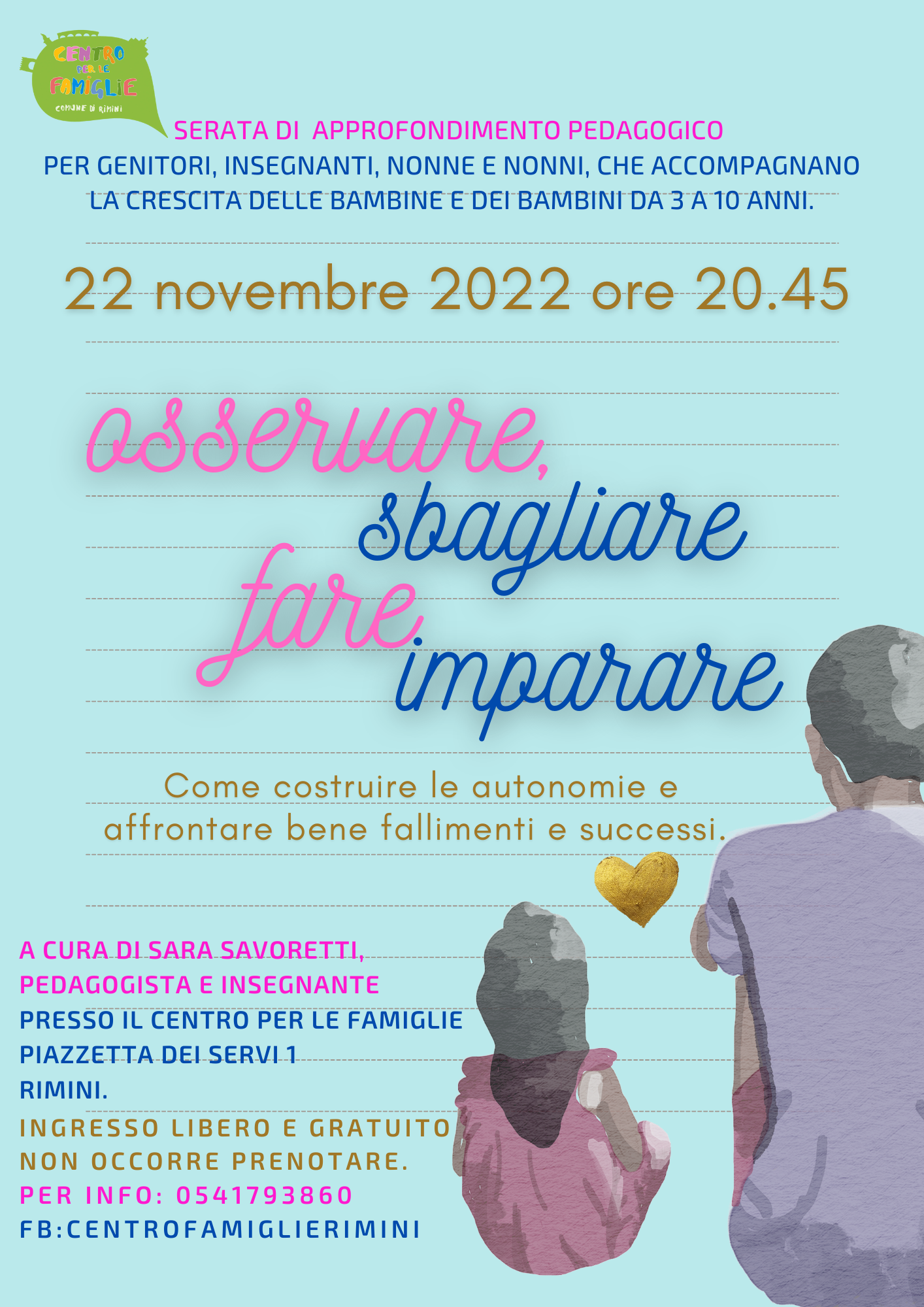 Di tutto questo e delle strategie più appropriate per essere degli adulti efficaci parleremo martedì 22 novembre ore 20.45 in presenza al Centro per le Famiglie con la serata dal titolo: ”OSSERVARE, FARE, SBAGLIARE E IMPARARE. Come costruire le autonomie e affrontare bene fallimenti e successi.”