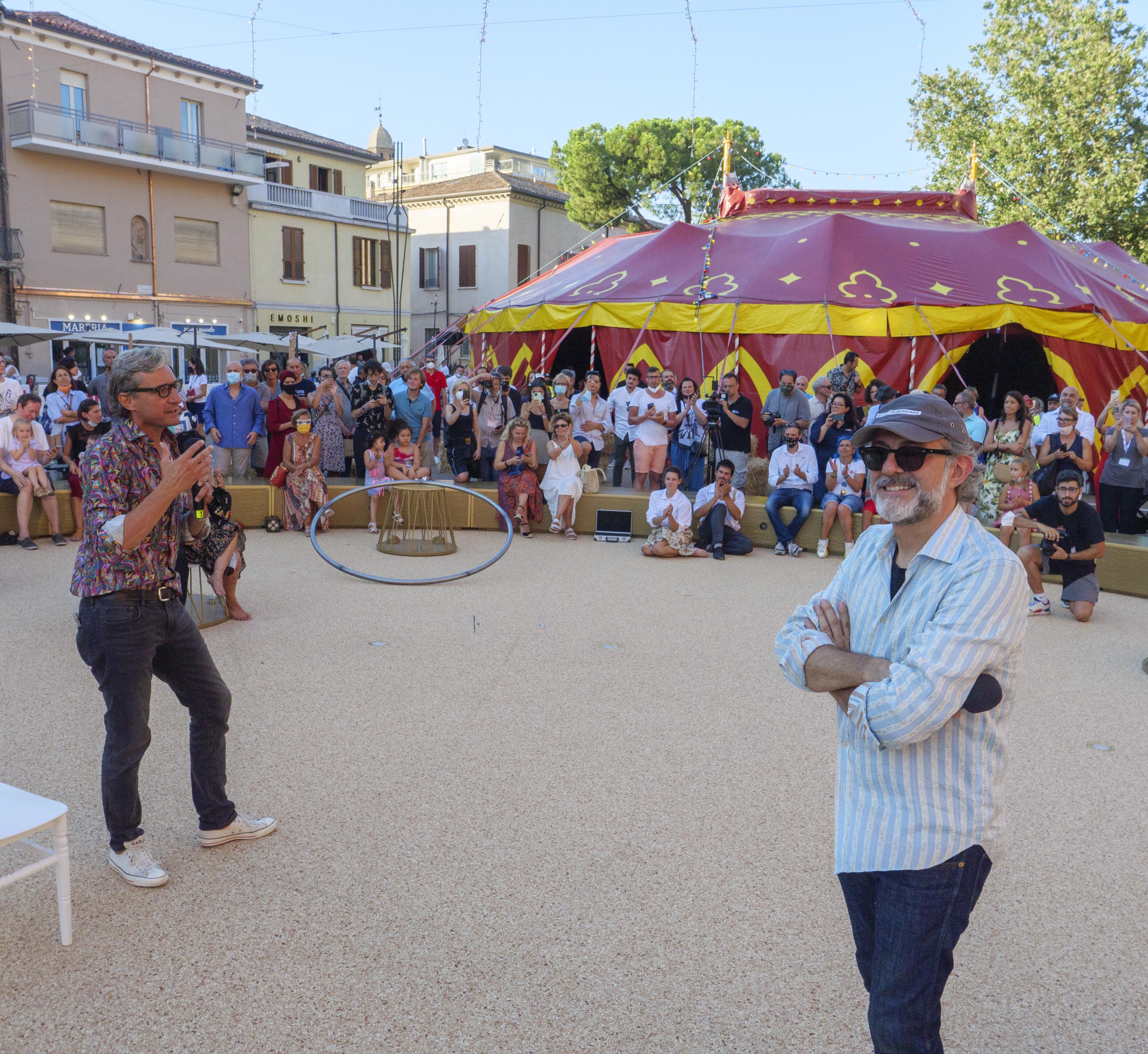 Lo chef stellato Massimo Bottura insieme al Sindaco Andrea Gnassi ha dato il via al circo mercato dei sapori all’interno della grande panca circolare in piazza Malatesta, a ricordare la grande pista circense, dorata, illuminata, che, come nel festoso girotondo finale di 8 ½, vuole essere un inno alla vita. In questo girotondo immaginifico, lo chef ambasciatore della cucina italiana nel mondo, Massimo Bottura e il Sindaco Andrea Gnassi hanno dato simbolicamente il via agli showcooking.