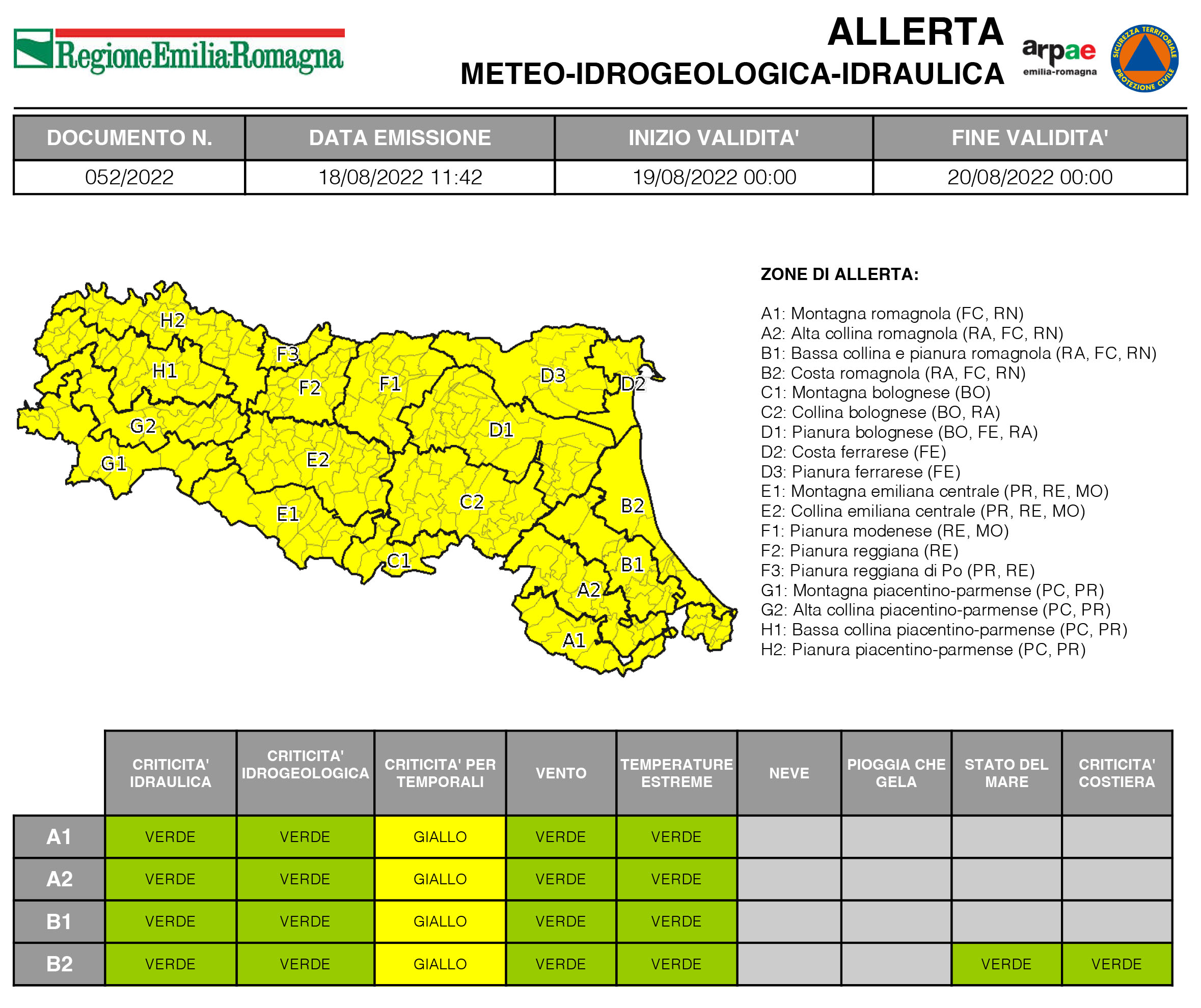 L’agenzia regionale di Protezione civile ha emesso un'allerta gialla di 24 ore per criticità temporali che riguarda tutta la regione Emilia Romagna. Per la giornata di venerdì 19 agosto (validità dalle ore 00:00 del 19/08/2022 alle ore 00:00 del 20/08/2022) sono previste condizioni favorevoli allo sviluppo di temporali forti, con possibili effetti e danni associati, più probabili tra la notte ed il mattino sulle pianure settentrionali e sul settore orientale.