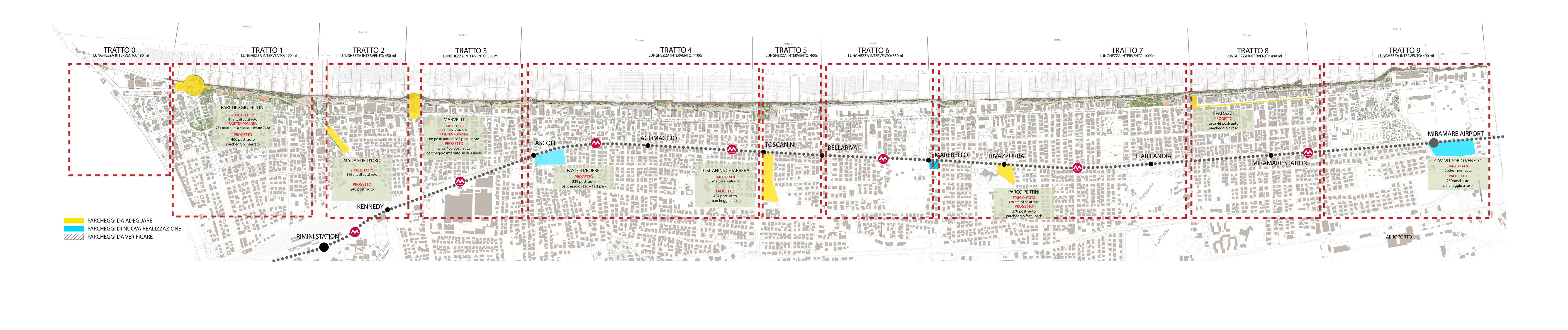 Per l’hub Kennedy - il primo ad essere interessato dagli interventi – è previsto un raddoppio dell’area di sosta a raso presente, con la creazione di ulteriori 100 stalli che si aggiungeranno ai 111 esistenti, per un totale di 211 posti. L’hub più importante in termini numerici sarà il fastpark di Toscanini, che prevede 467 posti auto (+147), mentre l’area sosta di Rivazzurra passerà dai 150 attuali ad un’offerta di 270 posti. Saranno invece realizzati ex novo gli hub di Pascoli (256 posti) e Miramare Airport, con una dotazione di circa 200 posti.