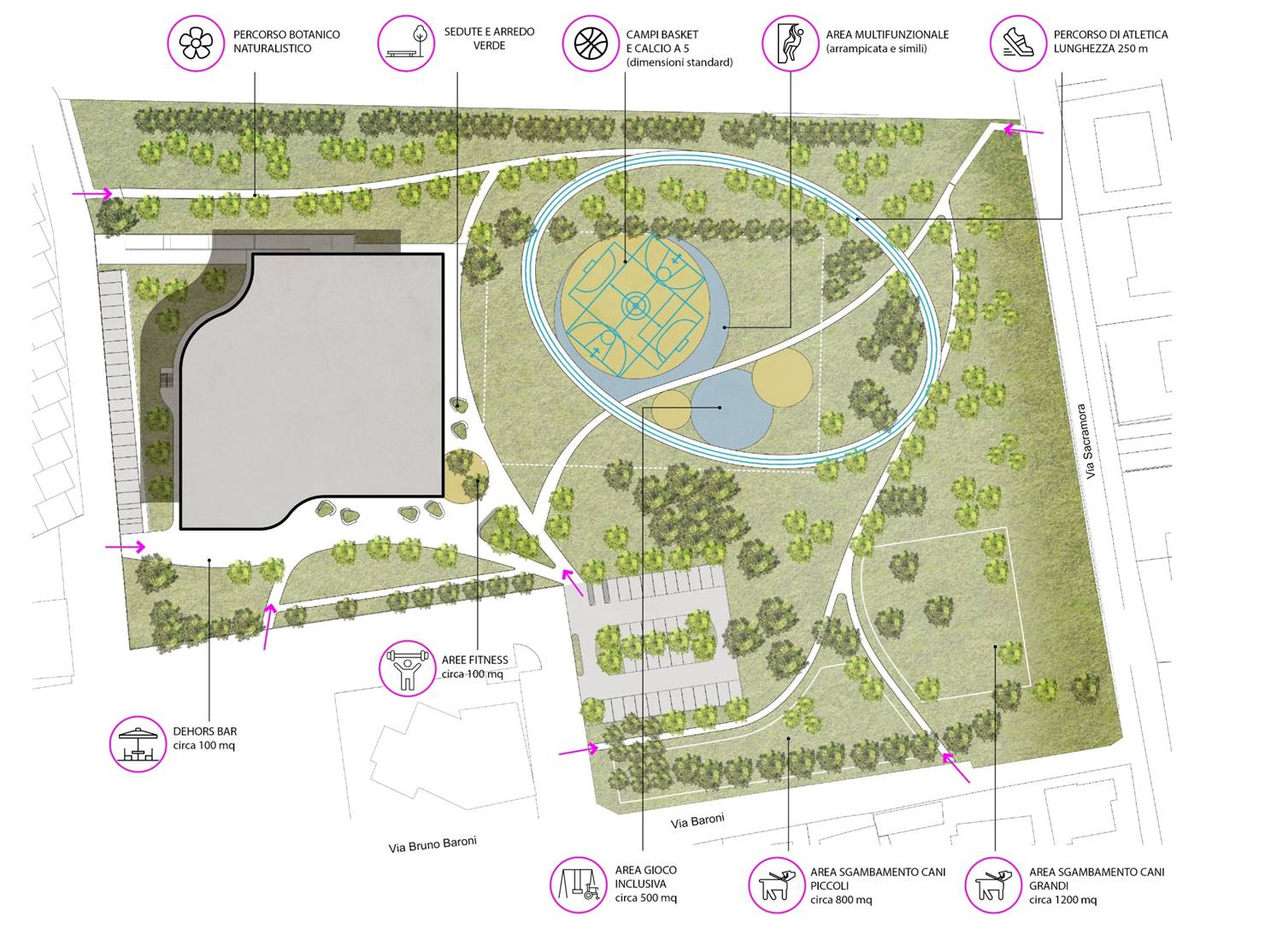 Saranno inoltre introdotte nuove funzioni dedicate allo svago e all’attività all’aria aperta, nell’obiettivo di fare del Parco Don Tonino Bello un nuovo polo dedicato allo sport all’aria aperta. Nell’ipotesi progettuale sono previsti un’area giochi inclusiva, un’area fitness, un playground per attività sportive, un’area multifunzionale e un percorso di atletica. Saranno inoltre ampliate le aree sgambamento cani. Le diverse aree saranno collegate da un percorso ciclopedonale, garantendo la piena accessibilità a tutti. Tutte le funzioni che richiedono una tipologia di pavimentazione diversa dal prato saranno realizzati sopra la vasca di laminazione interrata presente nell’area, che non sarebbe possibile attrezzare a verde. L’intervento utilizzerà strategie basate sulla natura (nature based solution: giardini della pioggia, invasi drenanti, bacini inondabili etc.), usando ad esempio soluzioni adattive in contrasto agli effetti del cambiamento climatico.