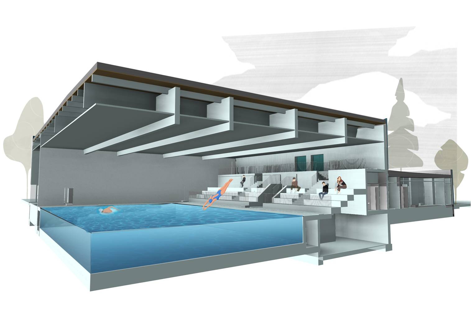 Il progetto prevede la presenza di funzioni complementari alla piscina che possano essere di supporto alle attività dei nuotatori, per la promozione del miglioramento dello stile di vita e dell’attività fisica per la comunità. Sono previsti una palestra con spogliatoi dedicati, un negozio di articoli sportivi, un punto ristoro, un deposito per le attrezzature in uso alle associazioni sportive che utilizzeranno l’impianto. A servizio della piscina saranno realizzati due parcheggi, nei lati sud-est e sud ovest del parco.