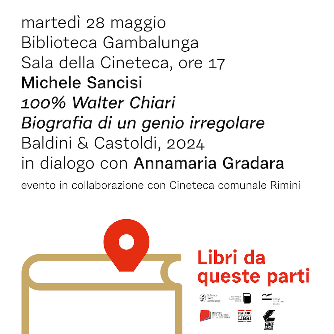 Nel centenario dell’attore e autore, nato l’8 marzo 1924, esce la prima completa biografia di Walter Chiari, firmata da Michele Sancisi con la collaborazione del figlio di Chiari, Simone Annicchiarico. Il volume 100% Walter Chiari. Biografia di un genio irregolare sarà presentato martedì 28 maggio alle ore 17 nella Sala della Cineteca, e appuntamento speciale per il Maggio dei Libri della rassegna Libri da queste parti.