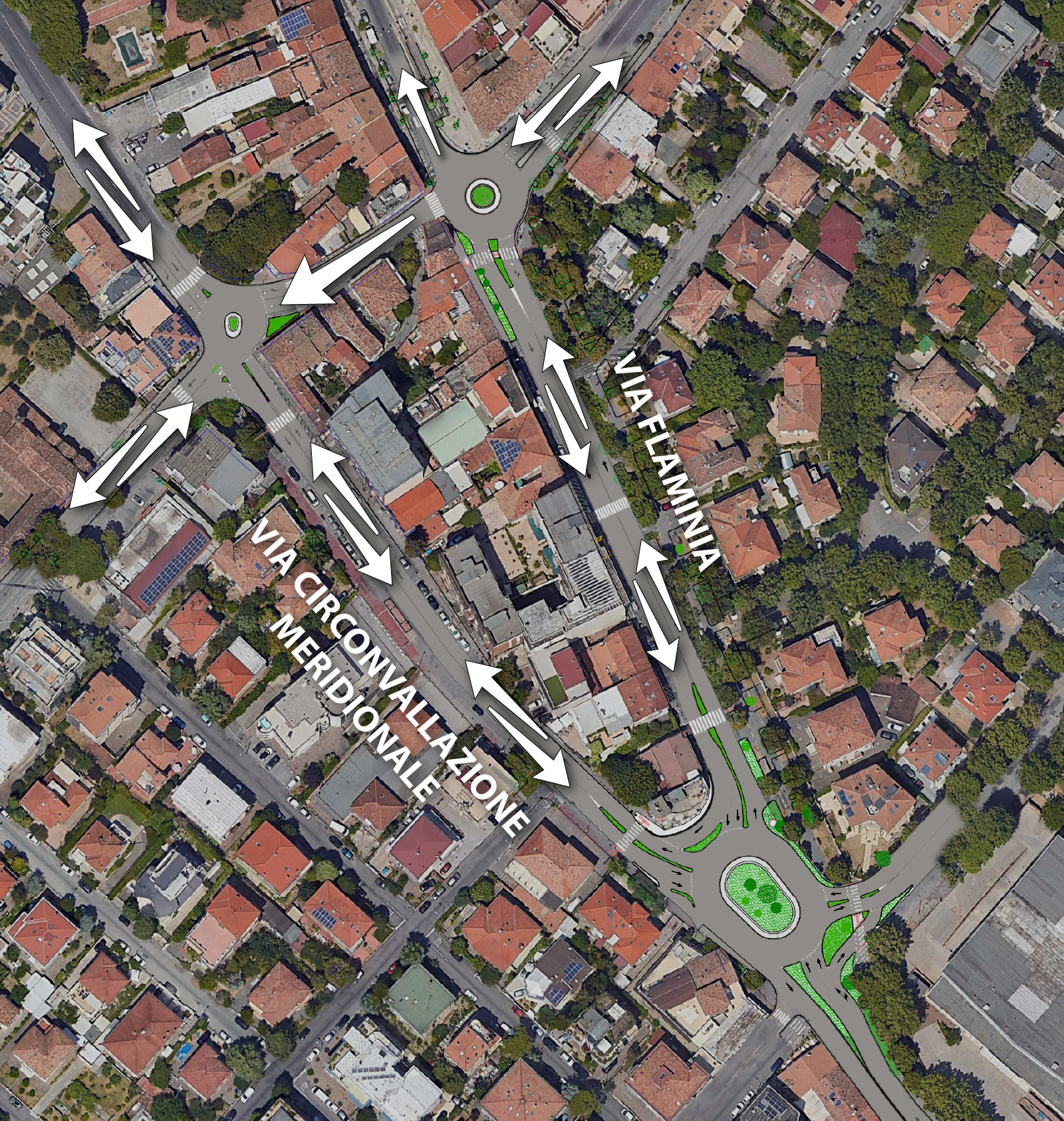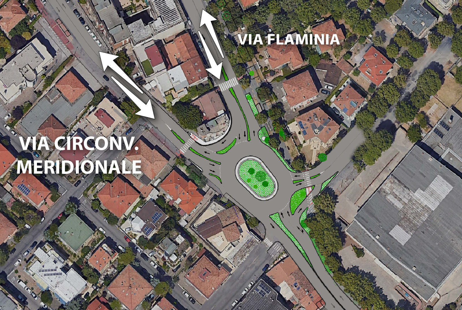 Procedono dunque come da cronoprogramma i lavori per la realizzazione della nuova rotatoria nell’area in cui si intercettano la via Flaminia, via Circonvallazione Meridionale, via Sardegna e viale IX Febbraio 1849 dove è già ben visibile la realizzazione della nuova rotatoria con isola centrale di forma ellissoidale che sarà ultimata entro il 31 luglio con la piantumazione delle essenze vegetali.