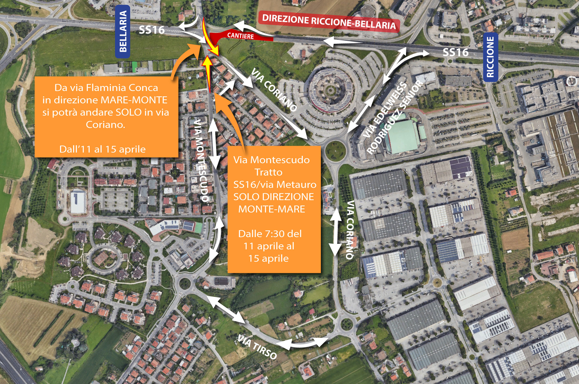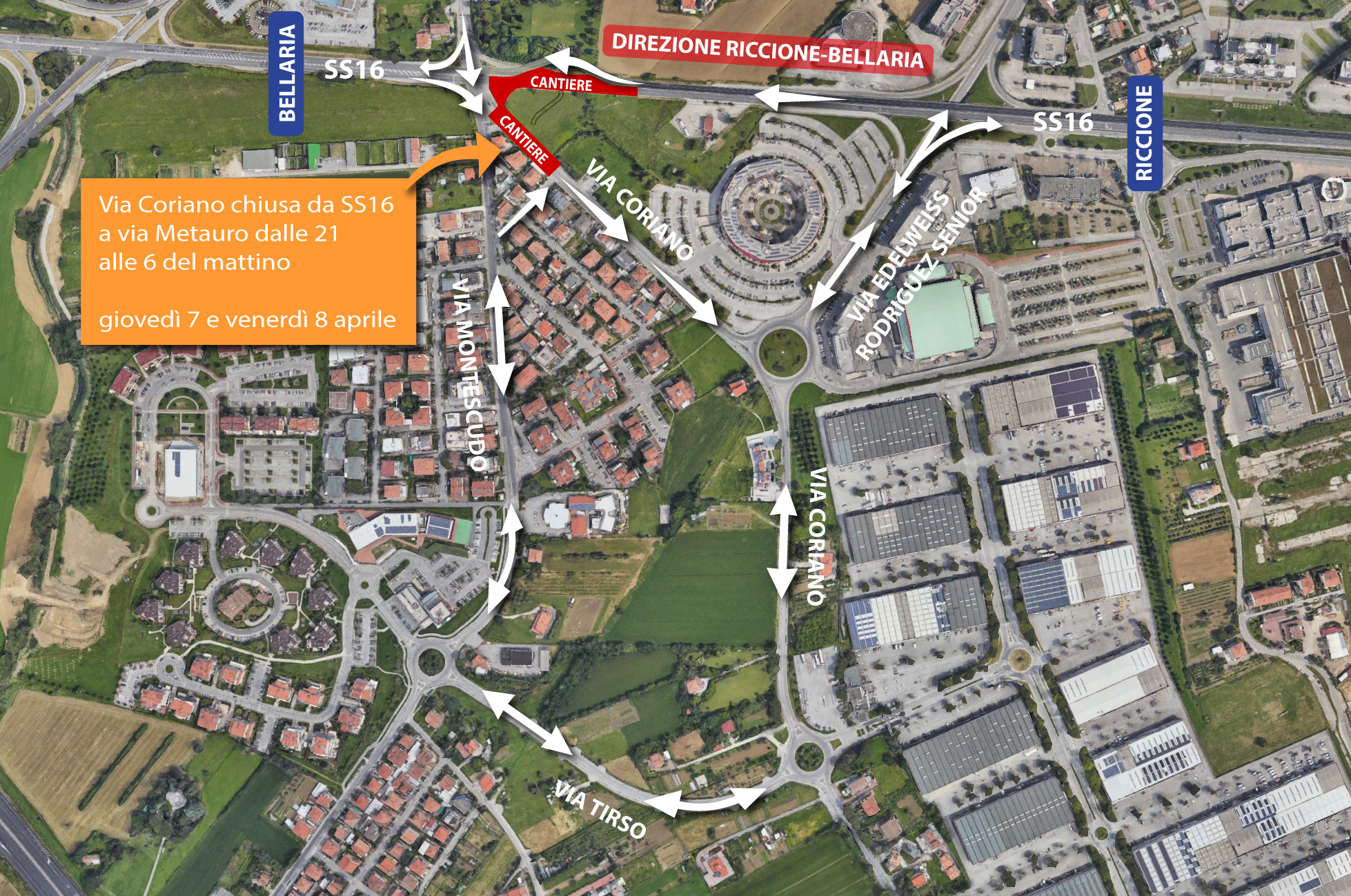 Per consentire la cantierizzazione specifica per la risoluzione dell’interferenza delle fognature sulle Vie Coriano e Montescudo, verrà effettuata una chiusura notturna del breve tratto di via Coriano compreso fra la strada statale 16 e la via Metauro nei giorni 7 e 8 aprile, dalle ore 21 alle 6 del mattino, che sarà presidiato costantemente dalla polizia locale. Gli automobilisti avranno la possibilità di proseguire sulla via Montescudo o di svoltare in via Metauro per immettersi in via Coriano dopo il tratto oggetto della chiusura.