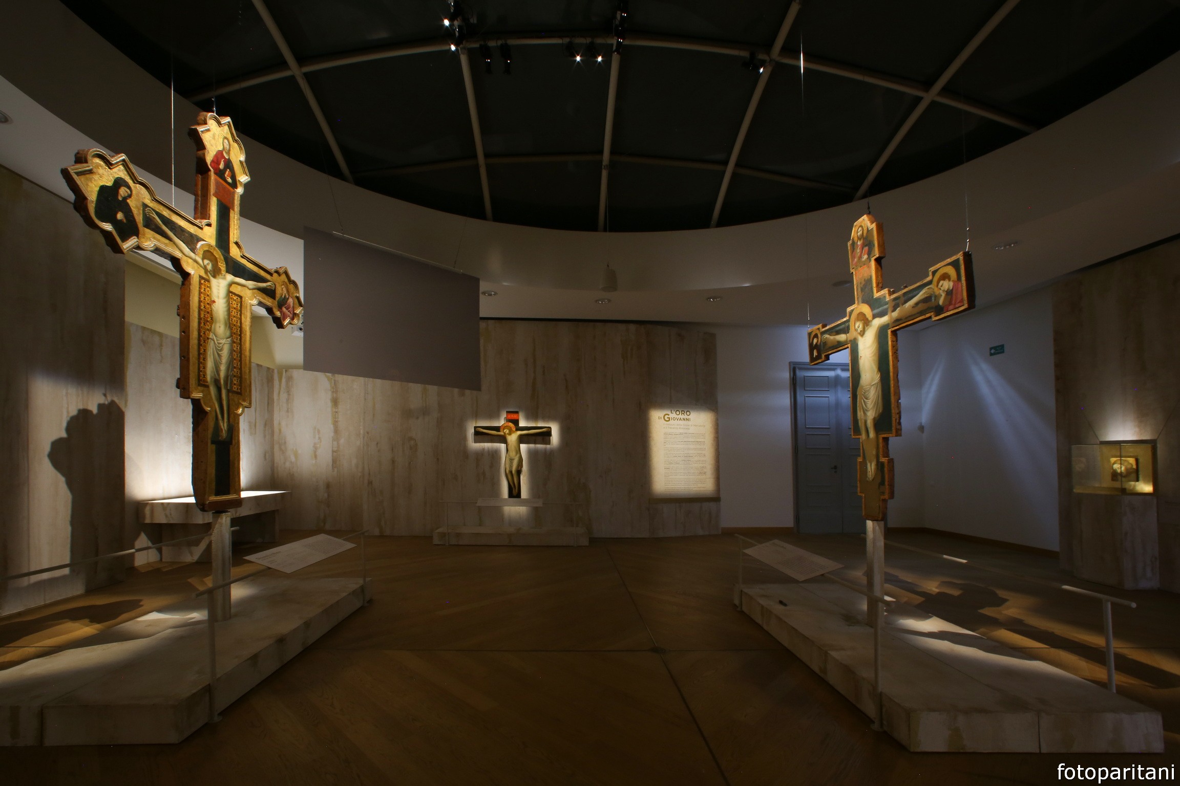 La mostra pone a confronto le croci di Giovanni presenti sul territorio italiano. All’opera di Mercatello si affianca l’importante croce dipinta della chiesa di San Lorenzo a Talamello e il più piccolo crocifisso “Diotallevi” dei Musei Comunali di Rimini, forse proveniente da Sant’Agostino. Altri confronti si possono avere con la croce sagomata dell’Antiquario Moretti di Firenze, il crocifisso Spina del maestro di Montefiore e la testa di Giuliano da Rimini, questi due ultimi di proprietà della Fondazione stessa e in deposito nei Musei Comunali.