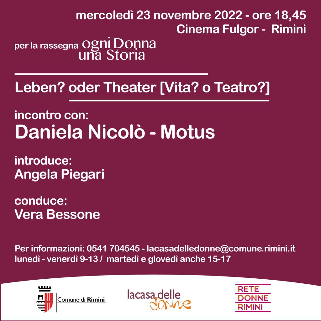 Questi alcuni dei temi che verranno affrontati insieme a Daniela Nicolo - attrice, regista e sceneggiatrice – nell’incontro di Mercoledì 23 novembre al Cinema Fulgor di Rimini alle ore 18,45  dal titolo Leben? oder Theater? [Vita? o Teatro?].  L’incontro – che sarà introdotto da Angela Piegari e condotto da Vera Bessone - è inserito nell’ambito della Rassegna “Ogni donna una storia”, a cura della Casa delle Donne del Comune di Rimini e Rete Donne Rimini.