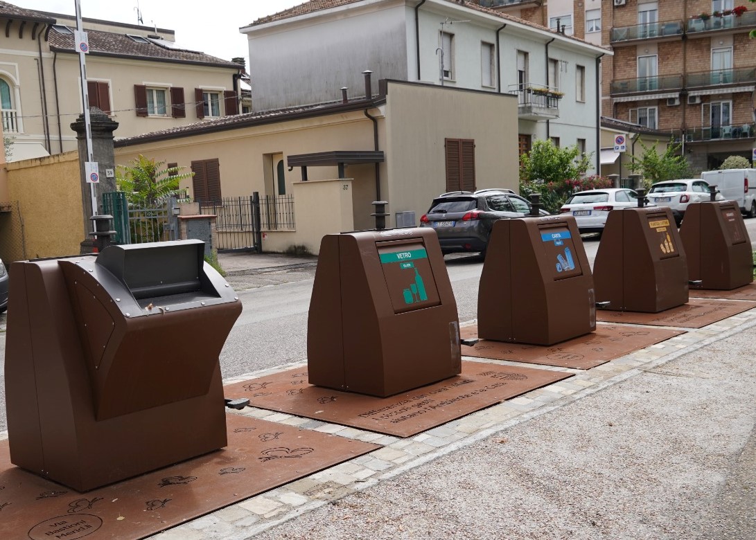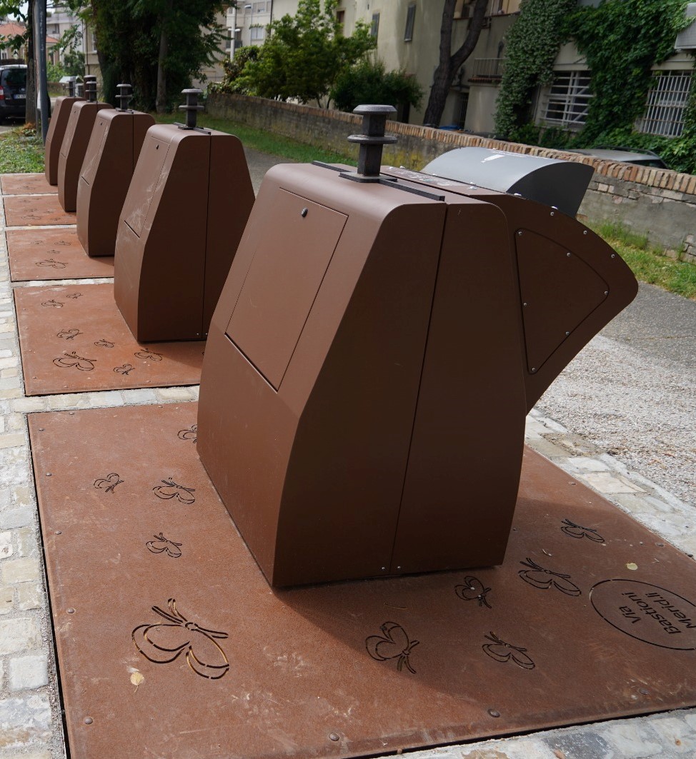 L’altra novità delle isole ecologiche riguarda il design. Il sistema di introduzione dei rifiuti è infatti costituito da una torretta con effetto “corten”, concordato nella forma e nel colore con la Soprintendenza all’Archeologia, Belle Arti e Paesaggi. Alla base della torretta un segno di decoro e bellezza, con un’incisione che richiama le farfalle di Tonino Guerra.