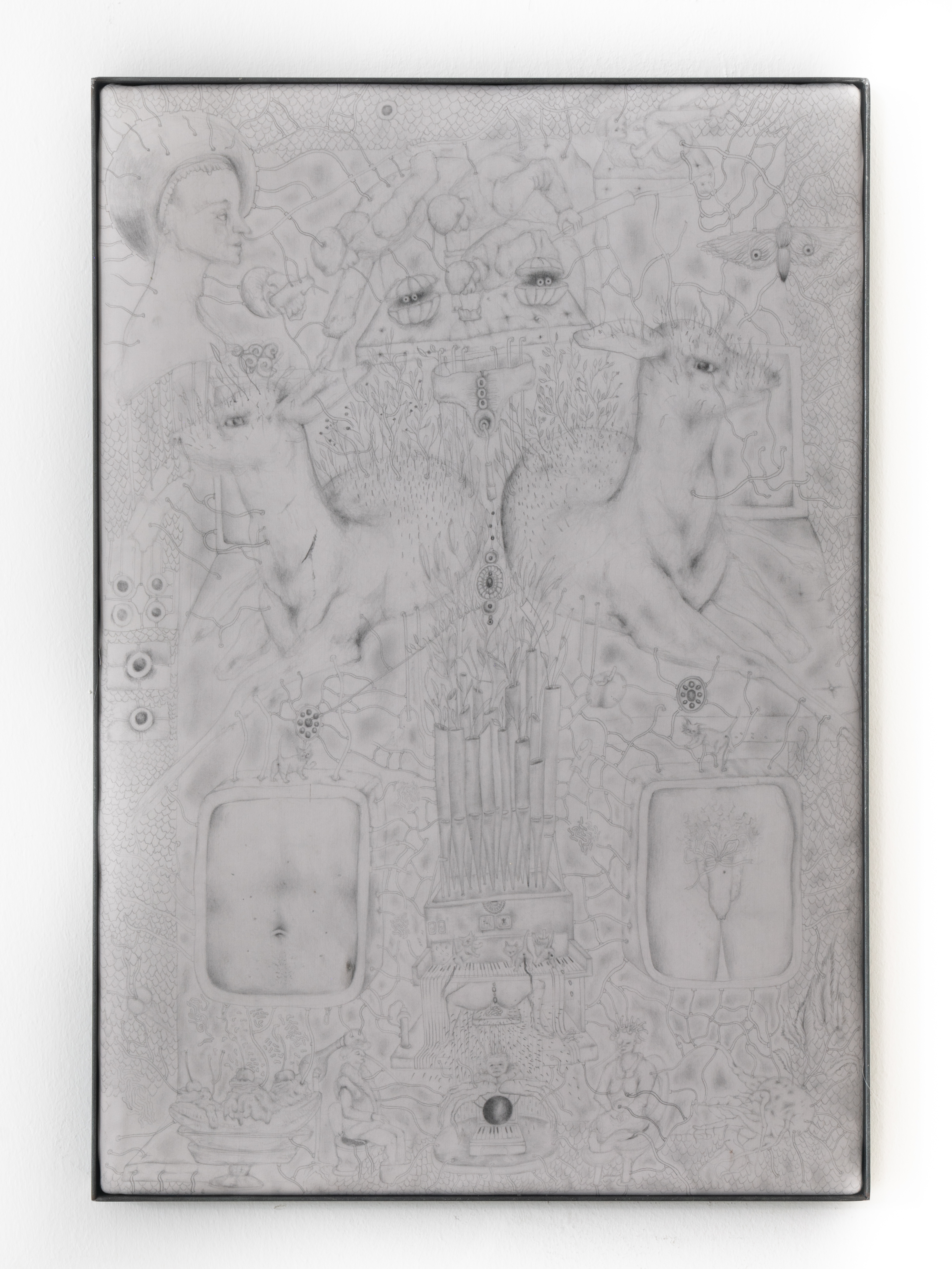Doctor Said I might Go Blind. It Helped Me see more clearly. 15 Feb.2022, 17:58 è un complesso disegno a matita su seta ovattata porta lo spettatore in uno spazio intimo e al contempo metafisico. È un’opera che nasce con l’intento di riflettere sulla natura della distrazione, intesa come quello stato mentale che permette connessioni inaspettate tra i momenti altalenanti di concentrazione e deriva. L’opera serve come contenitore di esperienze “divinamente inutili”, fugge la gravità e tende ad elevarsi verso una dimensione ultraterrena, un linguaggio nascosto, un po’ giocoso, attraverso cui sentirsi costantemente fuori strada. Ispirandosi all’iconografia surreale delle grottesche, il disegno rappresenta una specie di macchina ibrida che contiene e funziona tramite liquidi corporei, organi genitali, ortaggi, molteplicità di esseri umani, unicellulari, animali, dolciumi, gattini, parassiti viscerali e gioielli di pietre preziose le cui interconnessioni sono visibili grazie a collegamenti tubolari che ricordano vene, reti molecolari o biomeccaniche che passano attraverso i loro orifizi formando un unico ecosistema vivente che rimanda alle macchine celibi descritte da Michel Carrouges ma adattate ad una visione più compostista. Ciò che i personaggi rappresentati stanno operando, quando non sono assorti in una qualche riflessione o forse nel vuoto sono una serie di gesti rituali e di esercizi per la cura del sé che rivelano la centralità del corpo come origine della percezione. Il titolo è un frammento diaristico quotidiano, estratto da un articolo che ha distratto la mente dell’artista, e suggerisce che il senso si trova tra gli interstizi del reale.