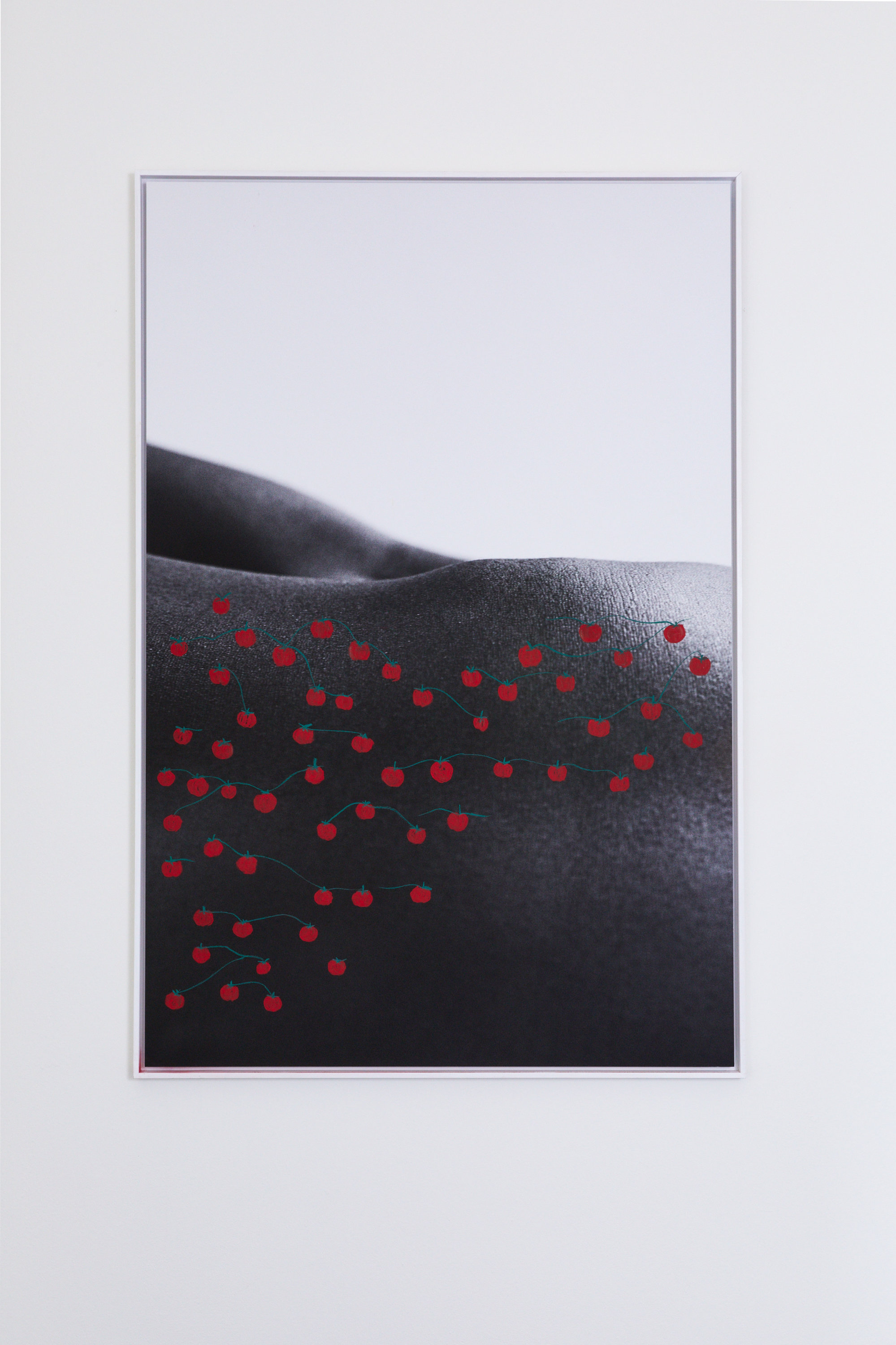 Paysage Corporel VII è la settima opera fotografica della serie ‘Paysages Corporels’, un corpus di fotografie ritoccate in superficie con pigmenti naturali. Il corpo femminile nero è la testimonianza evidente di dolori, violenze, lotte, sofferenze e disuguaglianze. Il rapporto ancestrale tra i corpi femminili e la Natura, ritorna in queste opere in cui vengono fotografate diverse parti del corpo dell'artista. Un Corpo come terreno di resistenza, di potere e di azione, illuminato da tracce di colori sulla superficie fotografica, che trasformano le linee, le tracce, le simbologie e le forme del corpo in viaggi, riflessioni e paesaggi armoniosi e idealmente infiniti. Queste tracce effimere, sono il risultato di un processo di questioning e di una continua ricerca interiore legata a rivendicazioni identitarie, al movimento ciclico delle donne, della Natura sotto una lente critica. In questa fotografia, in particolare, l’artista ha voluto disegnarsi addosso grappoli di pomodori con numerosi riferimenti storici, identitari e culturali. La fotografia a interpretazione aperta, come per tutte quante, riflette sulla cittadinanza e sul concetto di italianità a partire dal pomodoro, simbolo che ha accompagnato l’Italia nella storia dal passato al giorno d’oggi. I pomodori al giorno d’oggi oltre a essere colonna portante della gastronomia italiana, sono il fulcro di violenti sistemi di sfruttamento umano nelle piantagioni gestite dal Caporalato, nel Sud Italia.