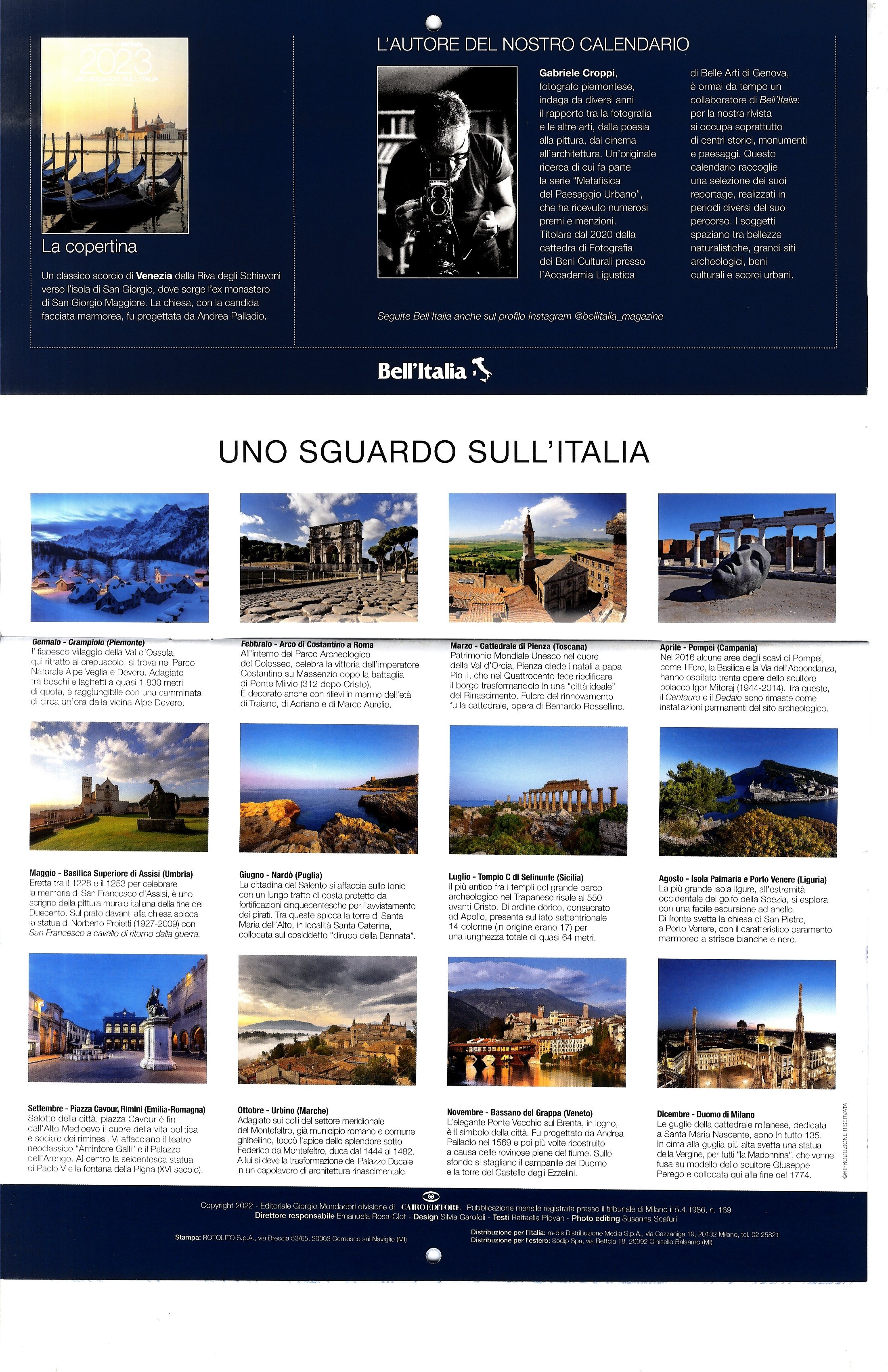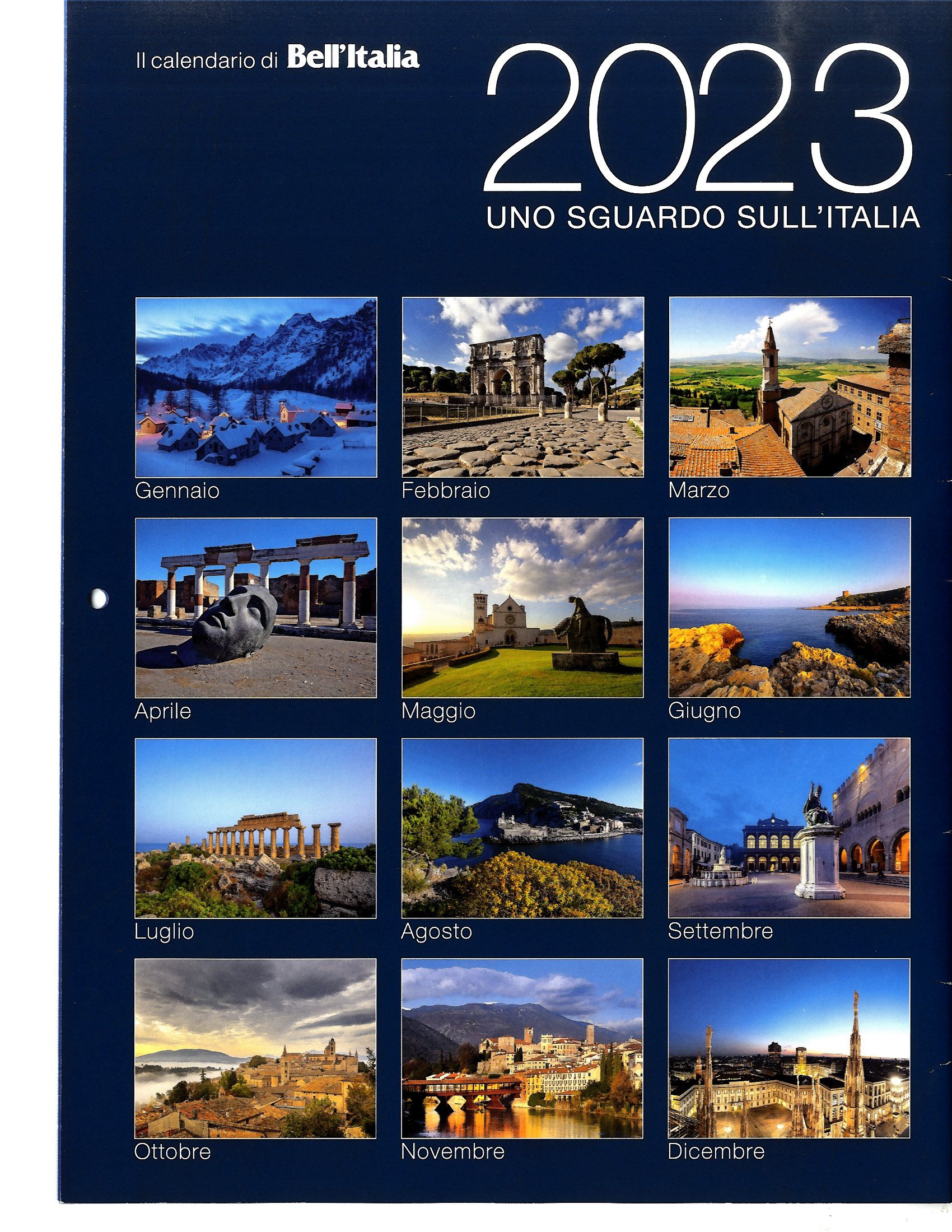 Tra le mete selezionate nel calendario per condurre il lettore tra le bellezze naturalistiche, i gradi siti archeologici, i beni culturali e gli scorci urbani della Penisola anche Crampiolo (Piemonte), l’Arco di Costantino a Roma (Lazio), la Cattedrale di Pienza (Toscana), Pompei (Campania), la Basilica Superiore di Assisi (Umbria), Nardò (Puglia), il Tempio C di Selinunte (Sicilia), l’Isola Palmaria e Porto Venere (Liguria), Urbino (Marche), Bassano del Grappa (Veneto) e infine il Duomo di Milano (Lombardia).