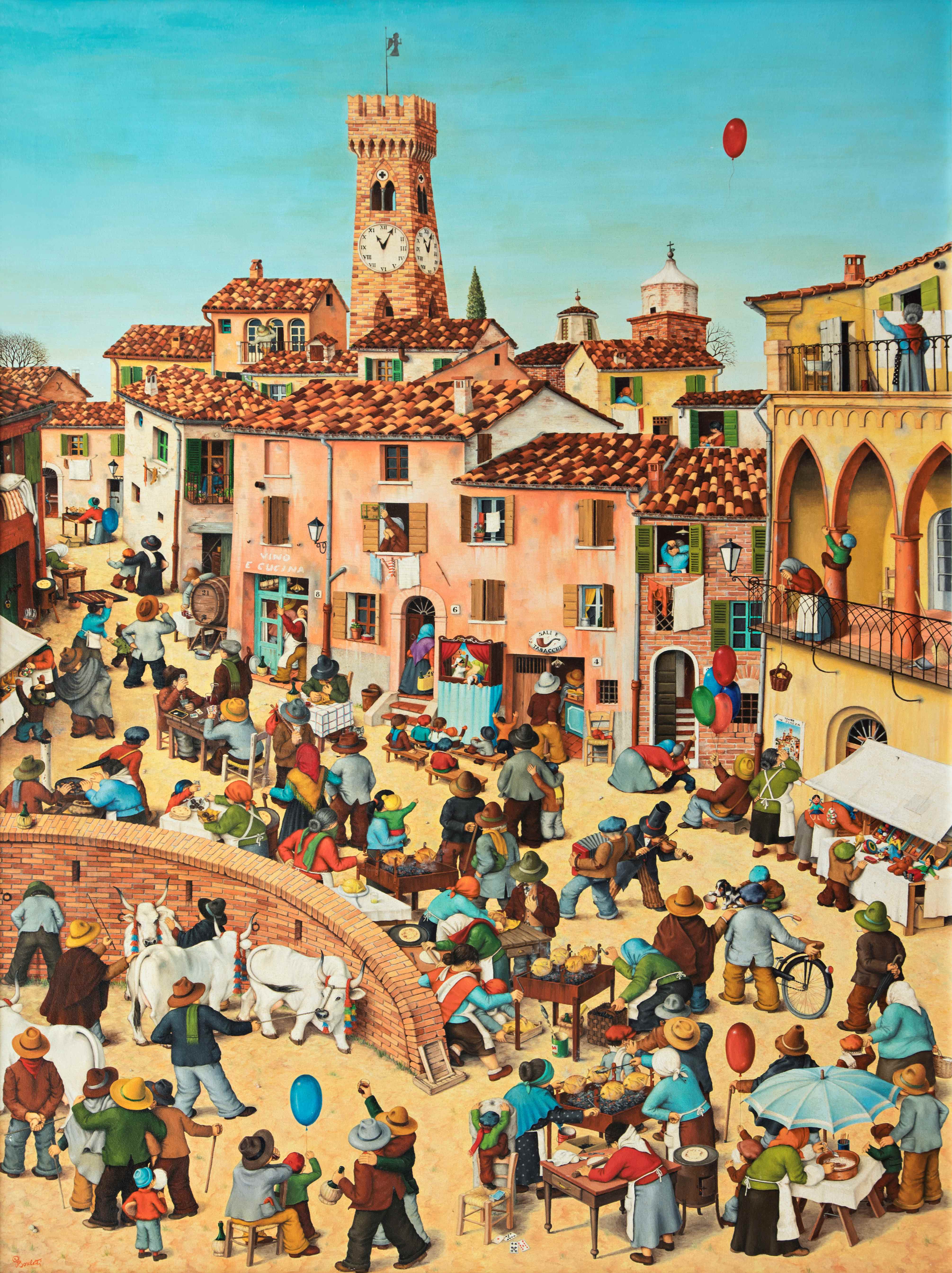 Un poeta delle immagini che ha saputo catturare l'essenza della vita quotidiana della nostra terra, fermare atteggiamenti, movenze, dettagli di strade e crocicchi, dargli voce e colore trasformandoli in opere d’arte. Inaugura il 3 agosto (alle ore 18 nella sede del Palazzo del Fulgor – Fellini Museum, alla presenza delle autorità, dei curatori e dei famigliari dell’artista) la mostra “Pino Boschetti. Dipingere in dialetto”, una monografica dedicata al pittore santarcangiolese che, con la sua pittura, ha immortalato momenti di vita e paesaggi che sono parte integrante del patrimonio emotivo e identitario della Romagna. La personale antologica di Boschetti, autodidatta e osservatore acuto della vita quotidiana del suo paese, ci conduce, attraverso 92 quadri ad olio e 30 disegni preparatori molti dei quali mai visti prima, in un viaggio visivo che racconta la ricchezza della vita di ogni giorno facendo emergere una poetica fatta di dettagli che ritrae monumenti, palazzi, angoli, tratti di mura, torrioni, acciottolato, capace di restituirne lo spirito, la vivacità. Un artista che della sua gente ha fermato atteggiamenti, movenze e di cui ha trasmesso anima, sentimenti, colori, pensieri.