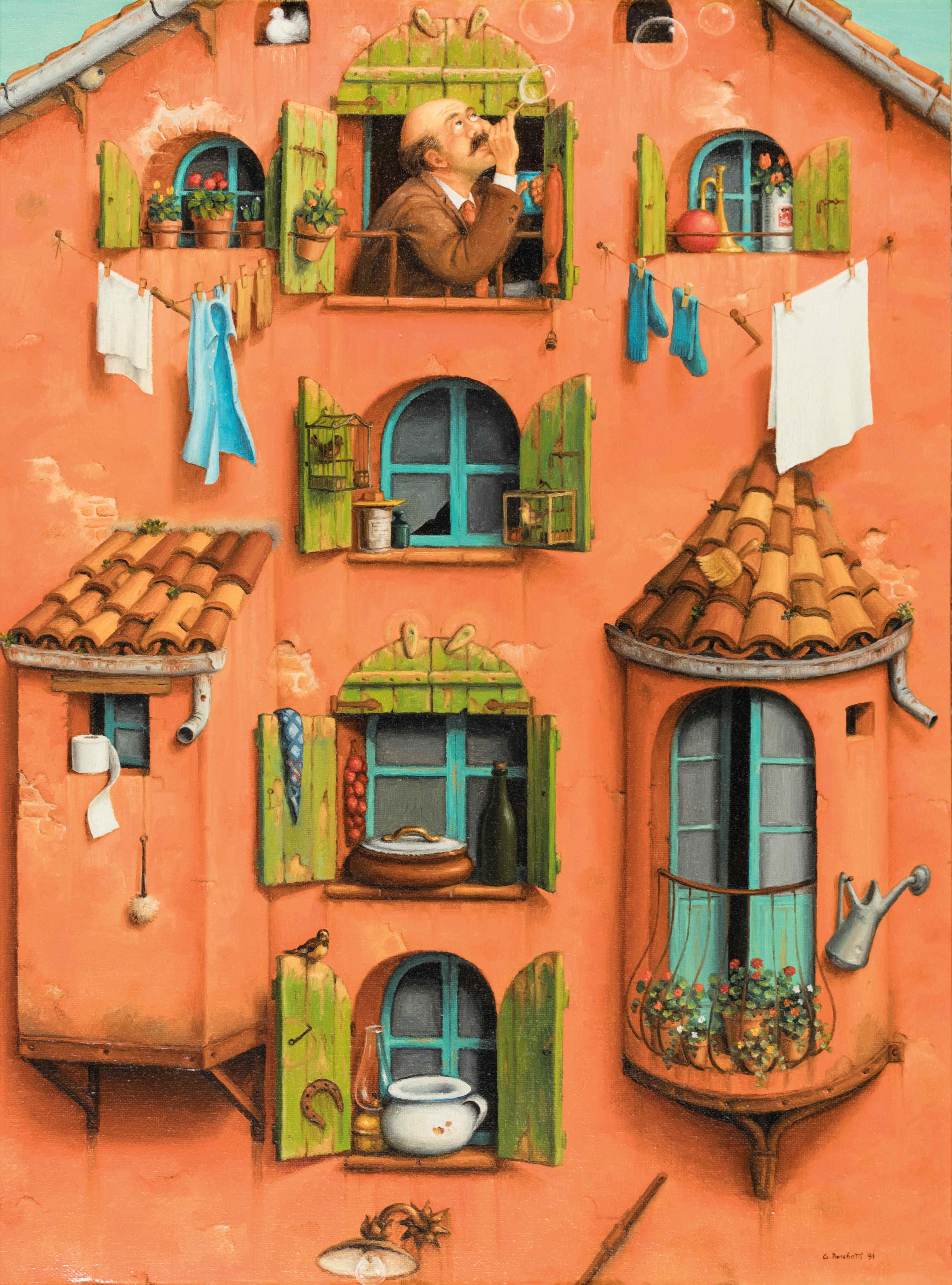All’ultimo piano di palazzo Nadiani, nel suo studio, rifugio sicuro, spazio dell’incanto e della meraviglia, ha dato vita ad una serie infinita di quadri a olio, in buona parte di grandi dimensioni, dove ha trasfigurato città e territorio grazie al suo sguardo immaginifico che navigava tra ieri e oggi, tra mondo contadino e mondo moderno, tra passato e presente, tra ricordo e immaginazione.