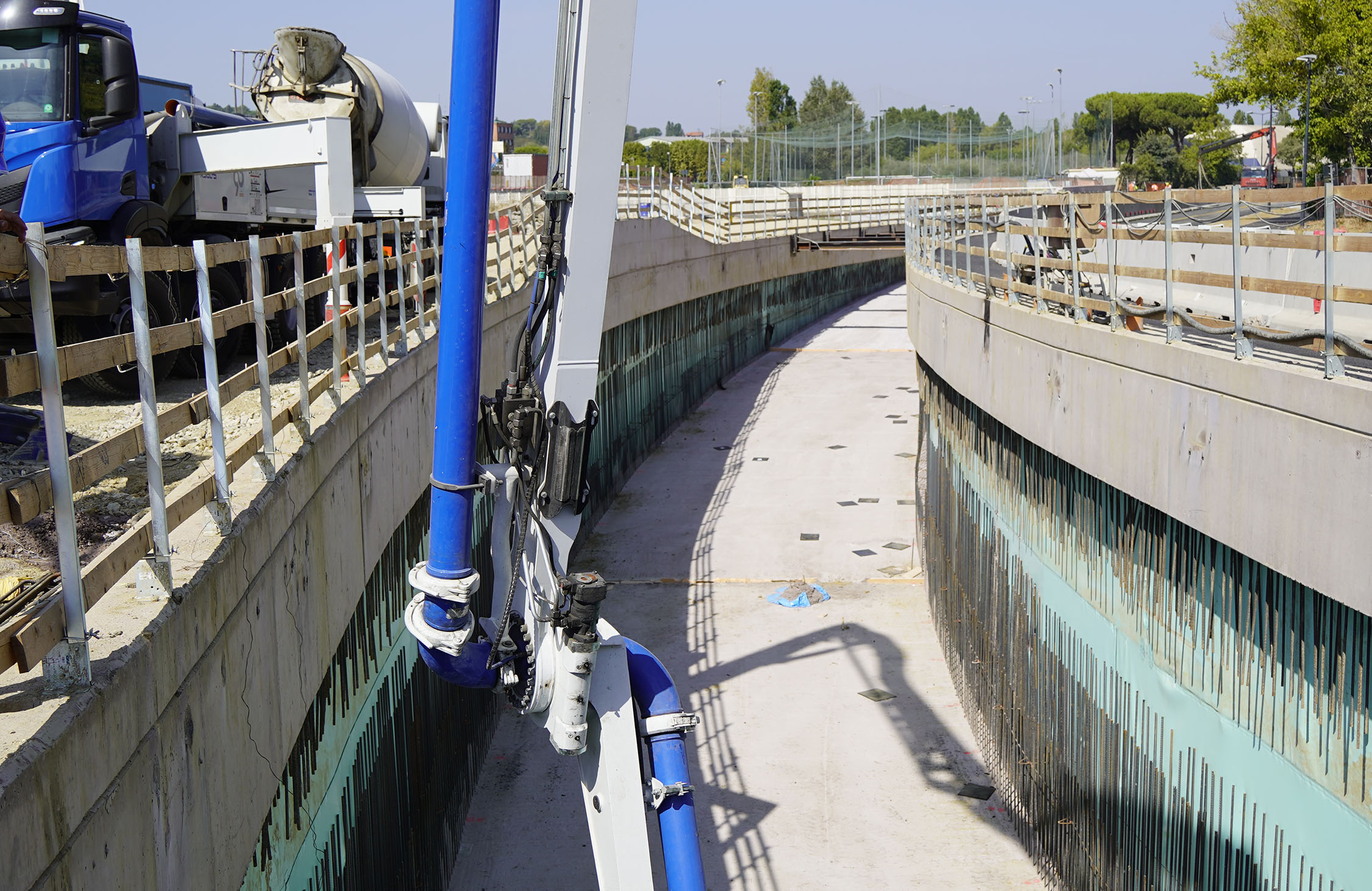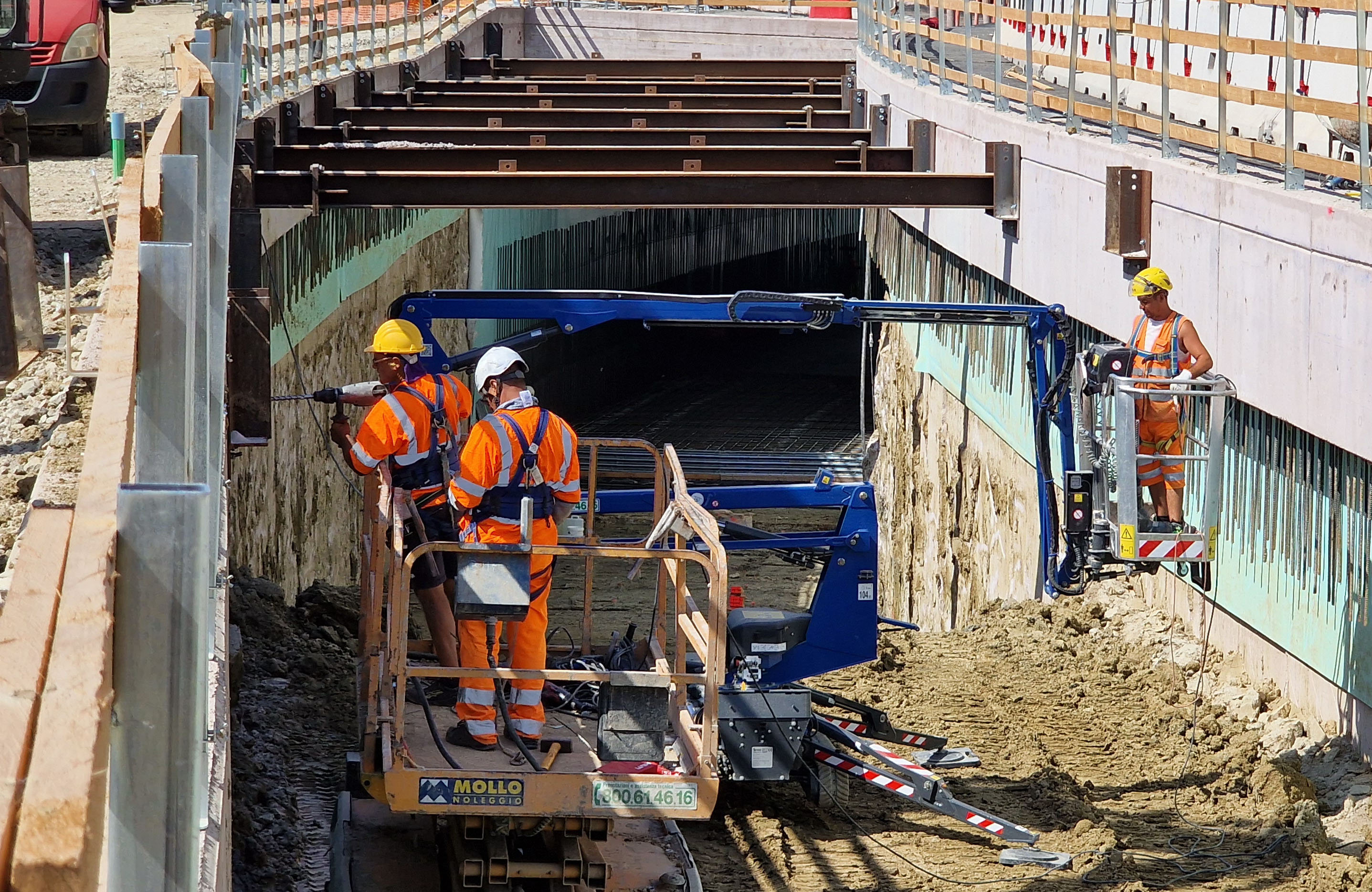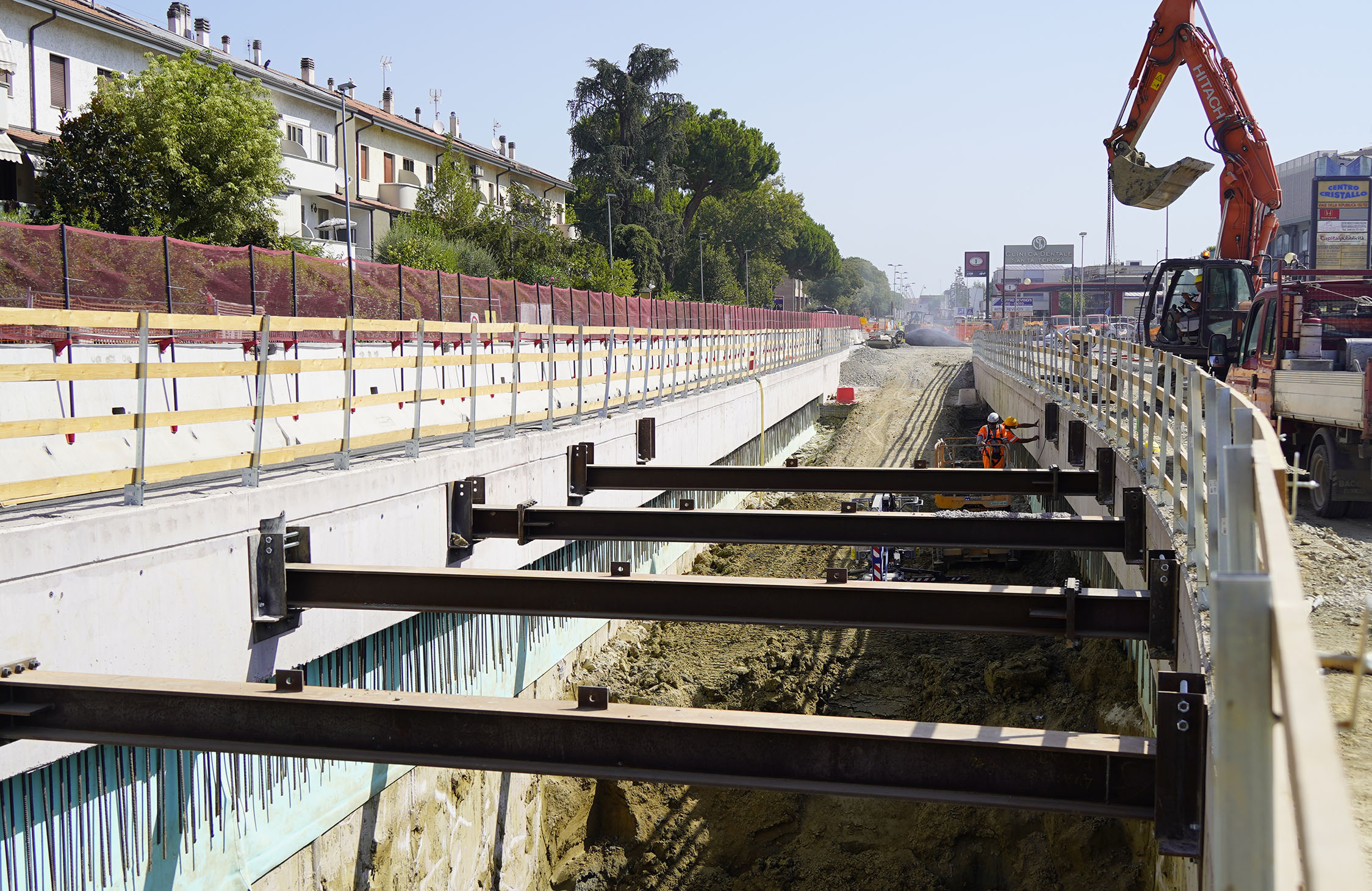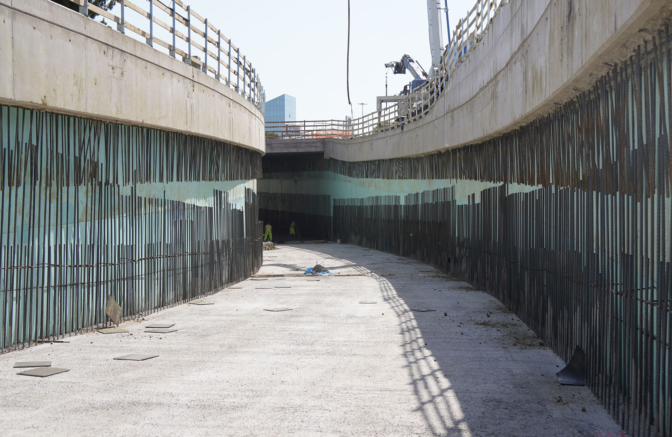 I lavori al sottopasso, in particolare, sono giunti a una fase cruciale in quanto, nel lato monte, sono già concluse le paratie, i cordoli e i getti della fondazione interna e le fodere del sottopasso. Per quanto riguarda il lato mare, sono in fase di completamento la posa dei puntoni provvisori che consentiranno di ultimare lo scavo fino alla quota di progetto. Puntoni che saranno tolti dopo il raggiungimento delle resistenze del cemento. Nel lato mare il completamento degli scavi consentirà poi l’ultimazione delle solette di fondazione e delle fodere interne.