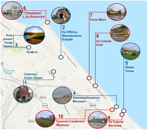 Il complesso Talassoterapico Rimini Terme, in località Miramare, si estende su 16.000 mq di aree di demanio marittimo, in concessione fino al 2031. Il Comune intende acquisirlo per riutilizzarlo nell’ambito del progetto Parco del Mare e per il recupero della ex colonia marittime Novarese.
