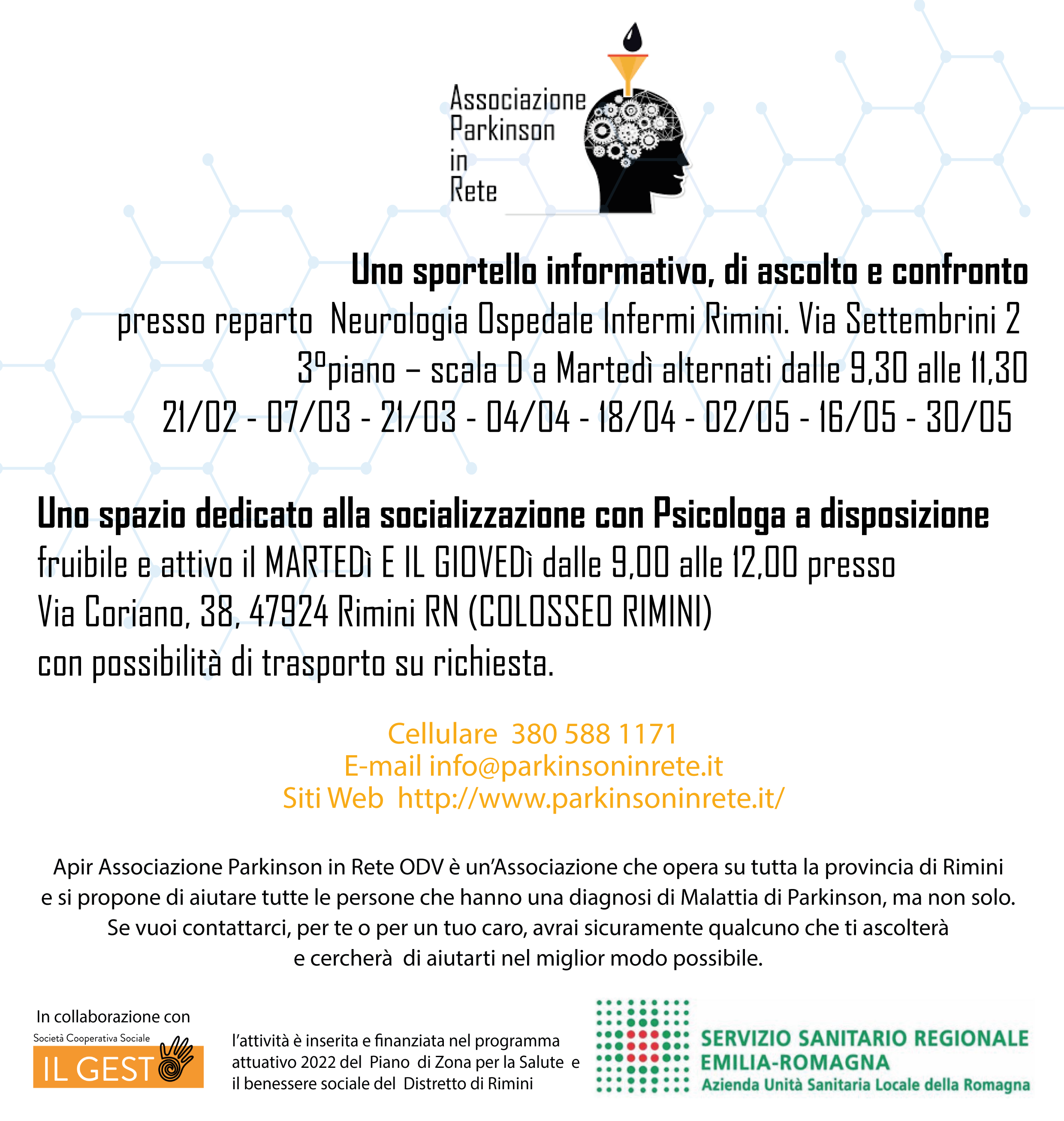 Dal 21 febbraio, invece, inizieranno le attività dello Sportello Informativo al reparto Neurologia dell’Ospedale Infermi di Rimini, un luogo di ascolto, informazione e confronto con operatori specializzati, rivolto a persone affette da Parkinson, familiari e caregiver.