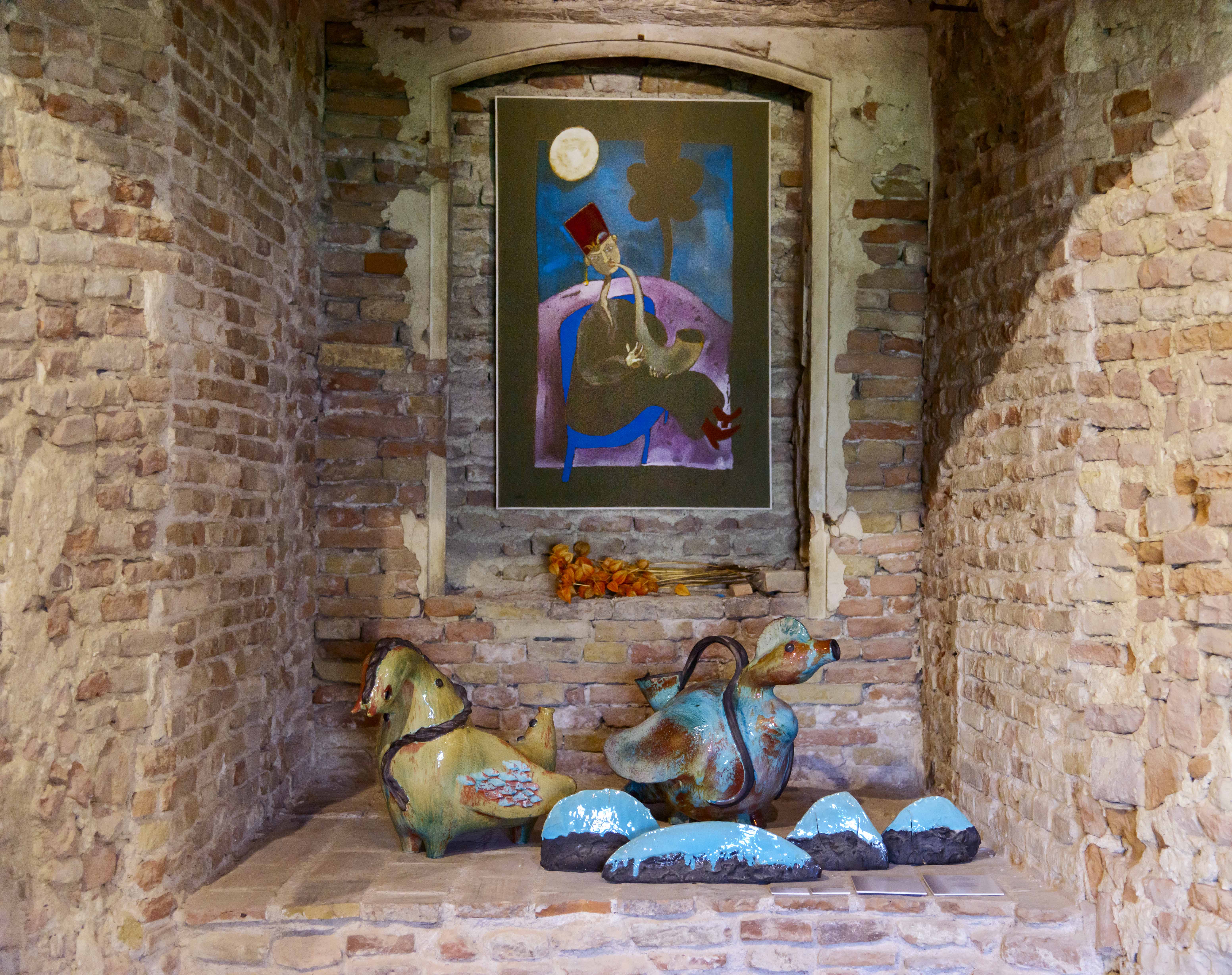 Il percorso espositivo presenta le “lucciole di bellezza", raccolta di quadri, libri e oggetti ideati dal Maestro e realizzati dalle mani sapienti degli artisti e degli artigiani.