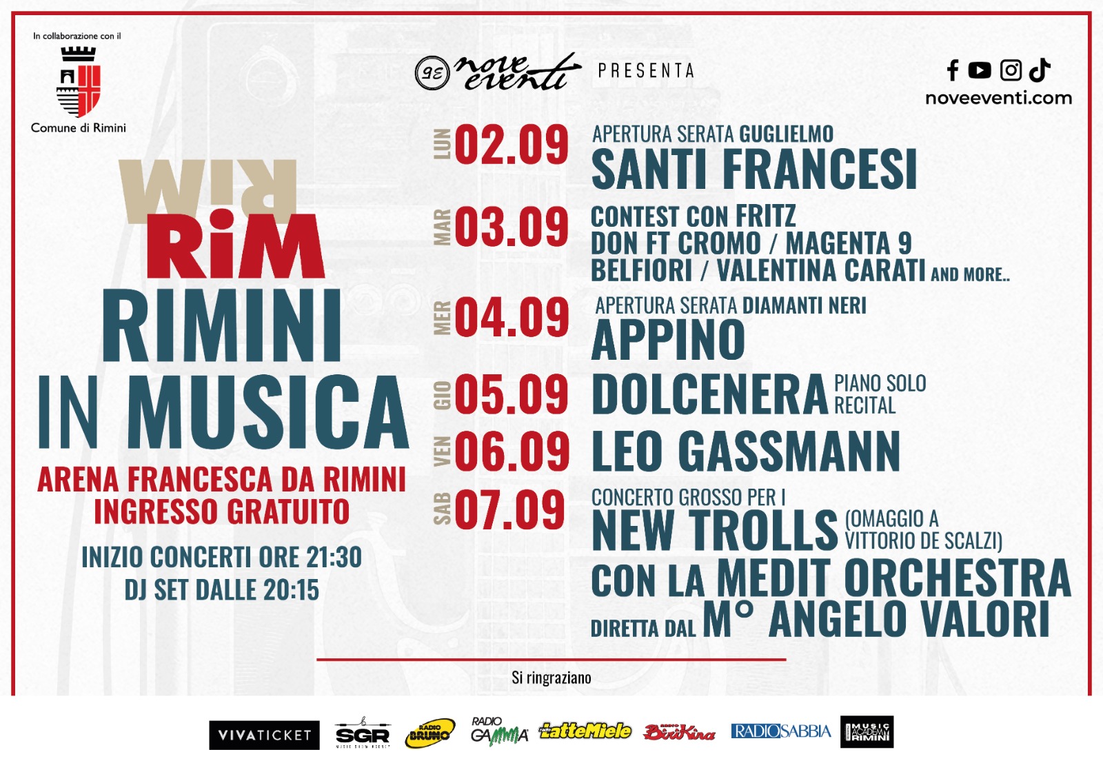 Nove Eventi, in collaborazione con il Comune di Rimini, presenta la seconda edizione di “Rim Rimini in Musica”, la rassegna musicale che si terrà dal 2 al 7 settembre presso l'Arena Francesca da Rimini. Questo evento promette di essere un appuntamento di grande interesse per tutti gli amanti della musica, grazie a una programmazione che ospita nomi importanti del panorama musicale italiano. Ad alternarsi sul palco all’ombra di Castel Sismondo il duo musicale Santi Francesi arrivati all’ultimo Sanremo dopo la vittoria di XFactor 2022; Il cantautore e chitarrista toscano frontman dei The Zen Circus, Appino; l’istrionica pianista, polistrumentista e cantautrice Dolcenera con il suo Piano recital; il talento di Leo Gassmann e, a chiusura della rassegna, l’omaggio a Vittorio De Scalzi con il Concerto grosso per i New Trolls diretta dal Maestro Angelo Valori e una band d'eccezione composta da Roberto Tiranti, Andrea Maddalone, Lorenzo Ottonello e Max Vigilante, ovvero i musicisti che hanno accompagnato in centinaia di concerti il fondatore nonché autore/coautore di tutti i brani dei New Trolls.