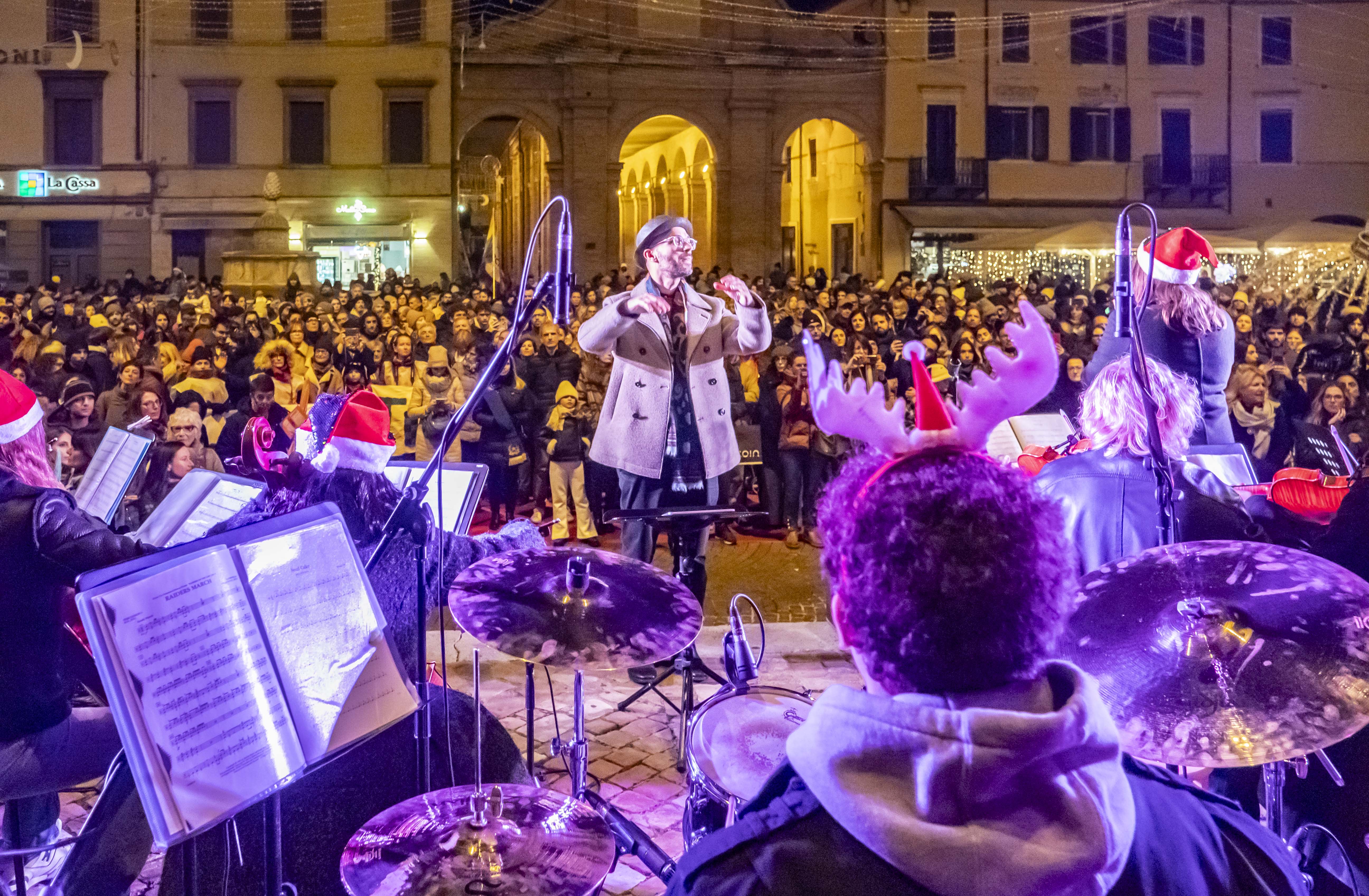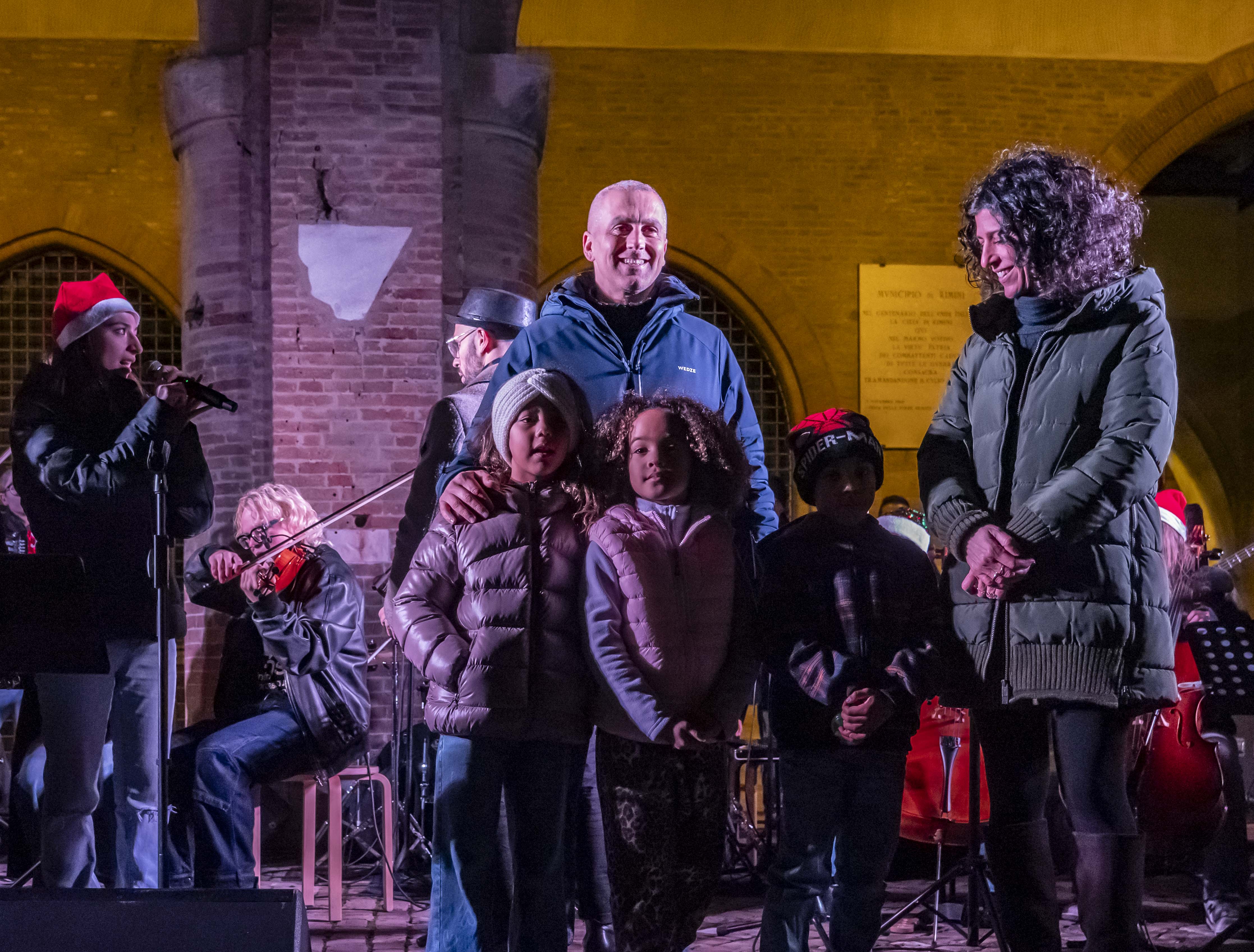 Ad introdurre l’accensione delle luci è stata l’Orchestra Eyos - Einstein Youth OrcheStar del liceo Einstein di Rimini, aprendo la festa al davanti al Palazzo dell’Arengo con un programma musicale di grande impatto: due brani tratti dall'album di debutto Urban Treasures (The Hidden Rhythm of the World e I See Through You), un’emozionante rein-terpretazione di Soul Cake, i classici natalizi All I Want for Christmas Is You, Jingle Bells Rock e Adeste Fideles, per culminare con un’esplosiva esecuzione di Right Here Right Now, sotto la guida del maestro Davide Tura.