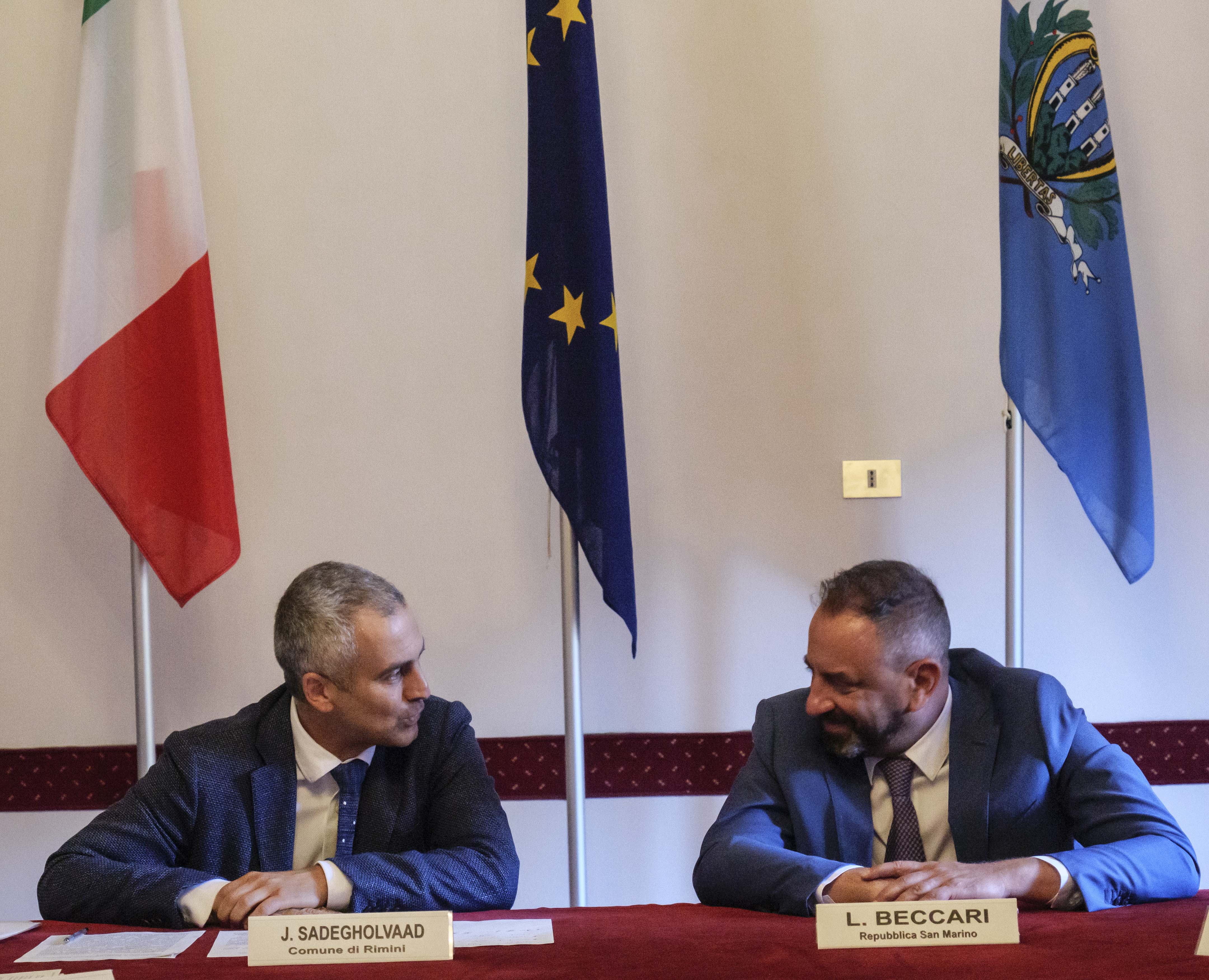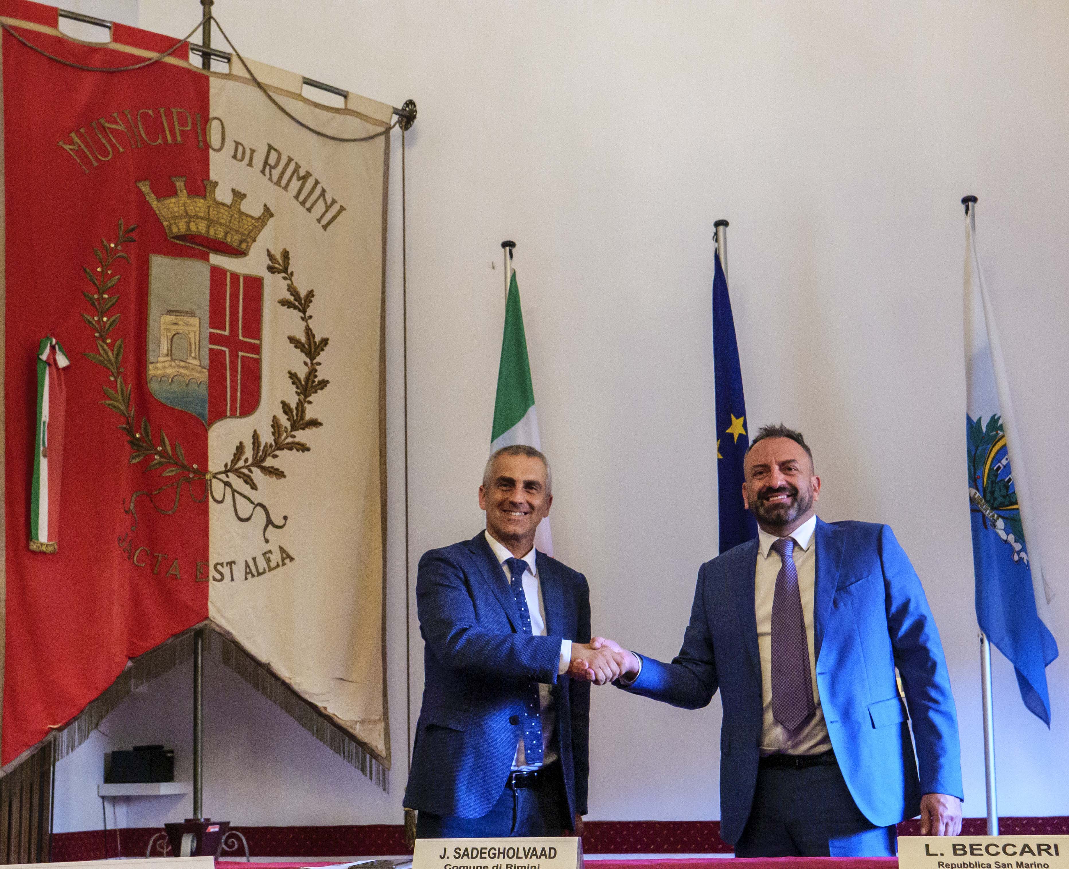 Rimini e San Marino unite per crescere attraverso una intesa istituzionale per l’elaborazione di un piano strategico condiviso. Con uno scambio ufficiale di note, formalizzato questa mattina alla presenza del Segretario di Stato per gli Affari Esteri della Repubblica di San Marino, Luca Beccari, e del Sindaco di Rimini Jamil Sadegholvaad, prende ufficialmente avvio la procedura di accordo per l'intesa istituzionale che, per la prima volta nella storia delle ottime relazioni di contiguità territoriale, stabilirà una serie articolata di progetti sinergici e collaborazioni tra la più antica Repubblica del mondo e la città di Rimini.